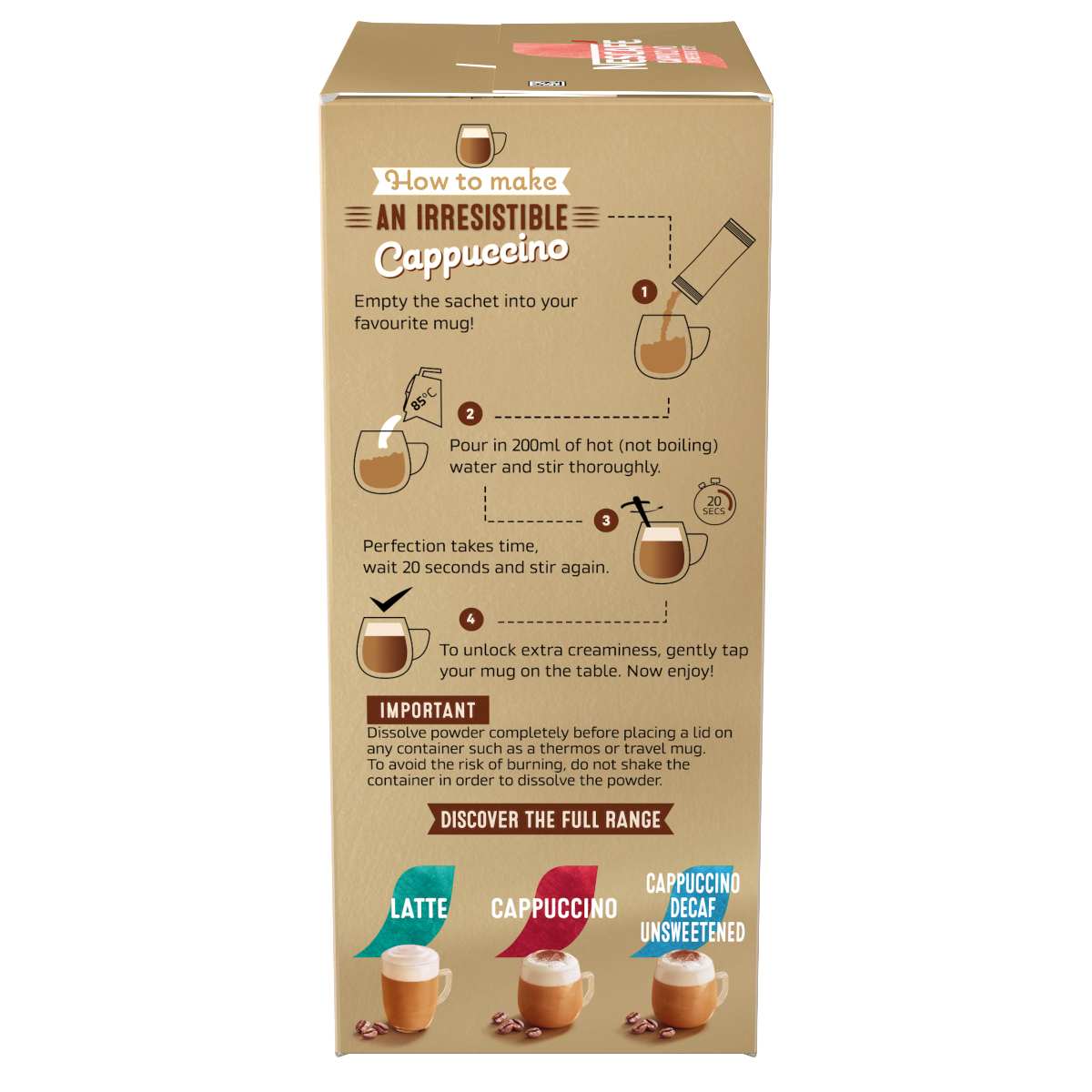 Discover the new NESCAFE® Cappuccino Unsweetened Taste, with less sweetness than NESCAFE® Cappuccino. Enjoy an aromatic cappuccino with velvety foam and low sugar content. A fine combination of coffee and milk, offering a rich taste with a more balanced flavour profile. Blend for an instant cappuccino drink.