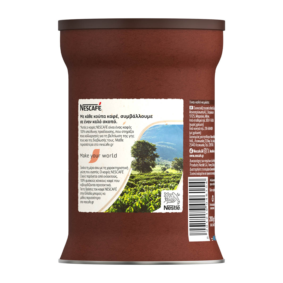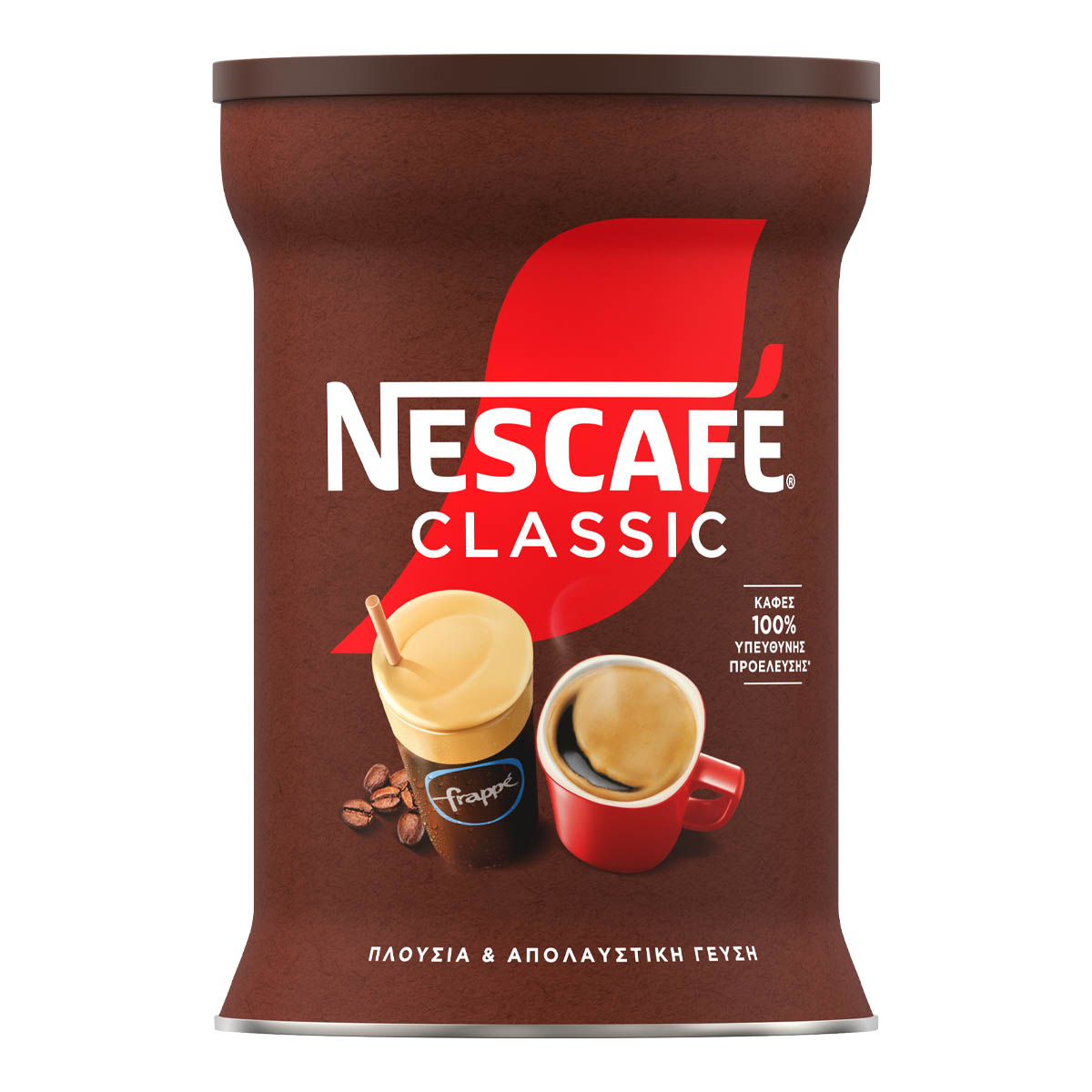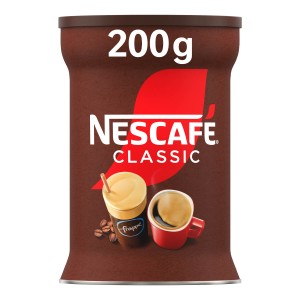 Instant coffee. NESCAFE® CLASSIC coffee is produced from fine Robusta coffee beans that are roasted moderately to strongly to give them the rich and delicious taste and aroma you know and love.The specially designed metal packaging keeps the taste of NESCAFE® CLASSIC delicious to the last drop and is recyclable.
