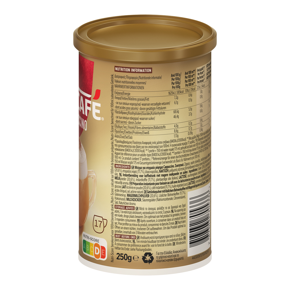 Discover the new NESCAFE GOLD Cappuccino. A combination of carefully selected ingredients of natural origin*. The secret lies in the combination of high altitude Arabica beans and Robusta beans that give the drink a rich and full-bodied flavour, while the rich milk adds a velvety creaminess, creating a unique coffee experience. With the quantity in the package you can make 17-20 servings.