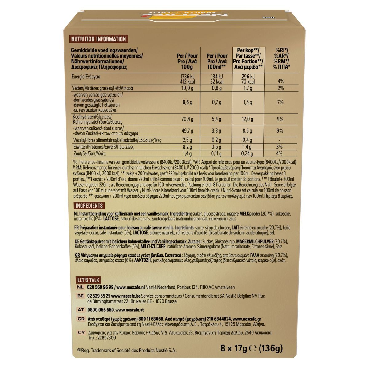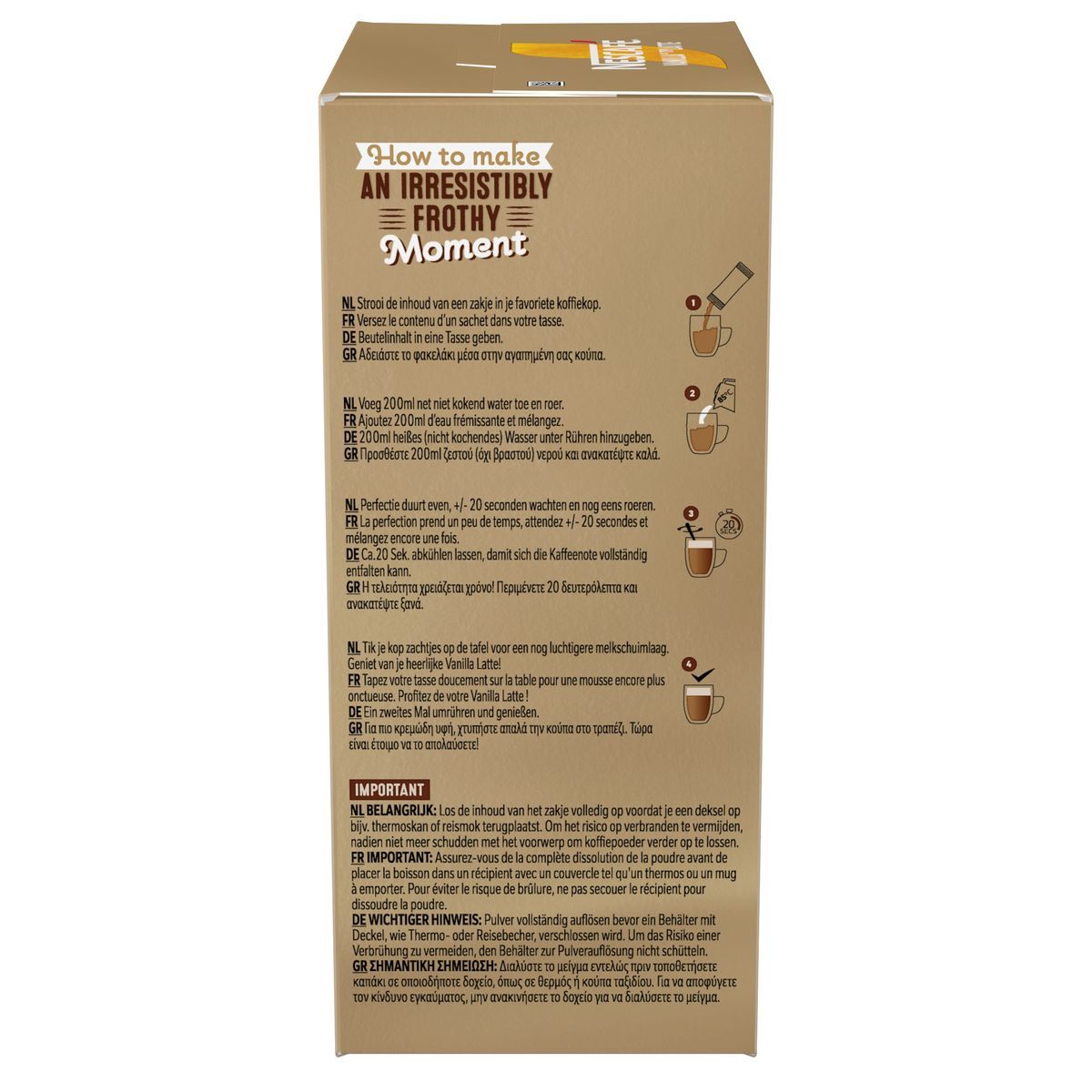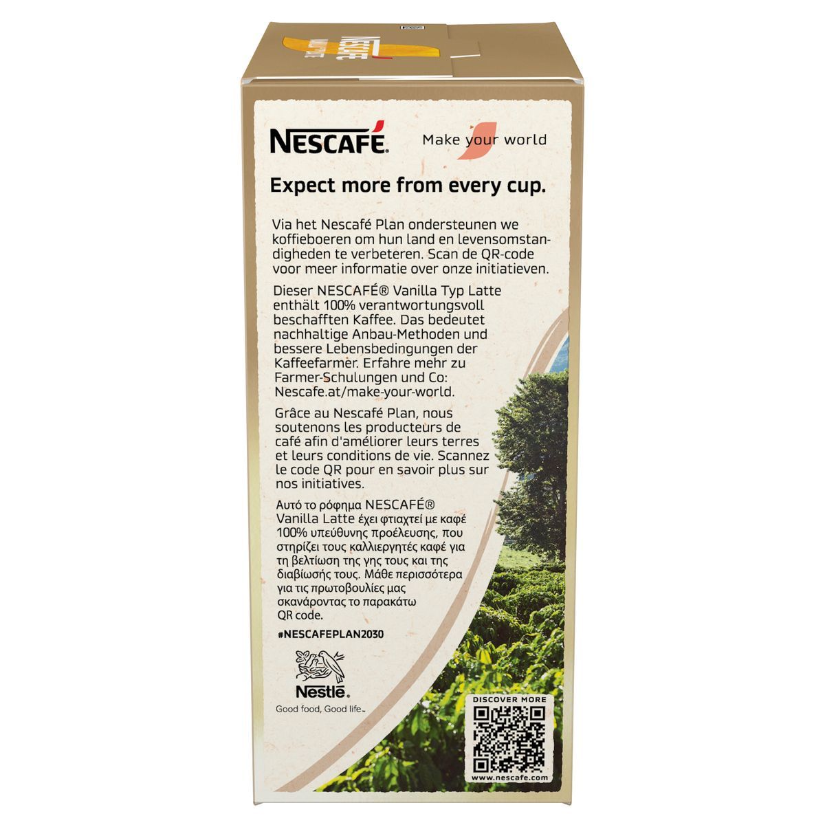 Μείγμα για στιγμιαίο ρόφημα καφέ με γεύση βανίλια. Ανακαλύψτε τον NESCAFE® GOLD Vanilla Latte! Ένα αρμονικά καβουρδισμένο χαρμάνι καφέδων Arabica και Robusta με λεπτοαλεσμένους κόκους καφέ και βελούδινα αρώματα βανίλιας. Εξαιρετική γεύση Vanilla Latte με βελούδινη κρέμα και πλούσιο άρωμα βανίλαιας γεμίζουν κέφι το φλυτζάνι σου. Θέλεις κάτι απαλό και μοναδικά απολαυστικό, με αισθησιακή γεύση και πλούσιο άρωμα; Η λύση είναι μία, NESCAFE® GOLD VANILLA LATTE… Μία πρωτόγνωρη γευστική εμπειρία ξετυλίγεται μπροστά σου, τόσο απλά!