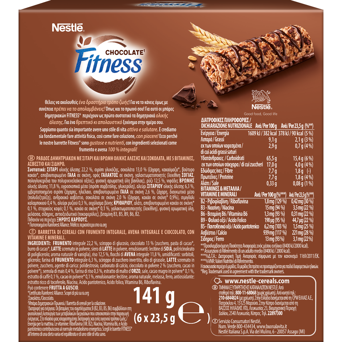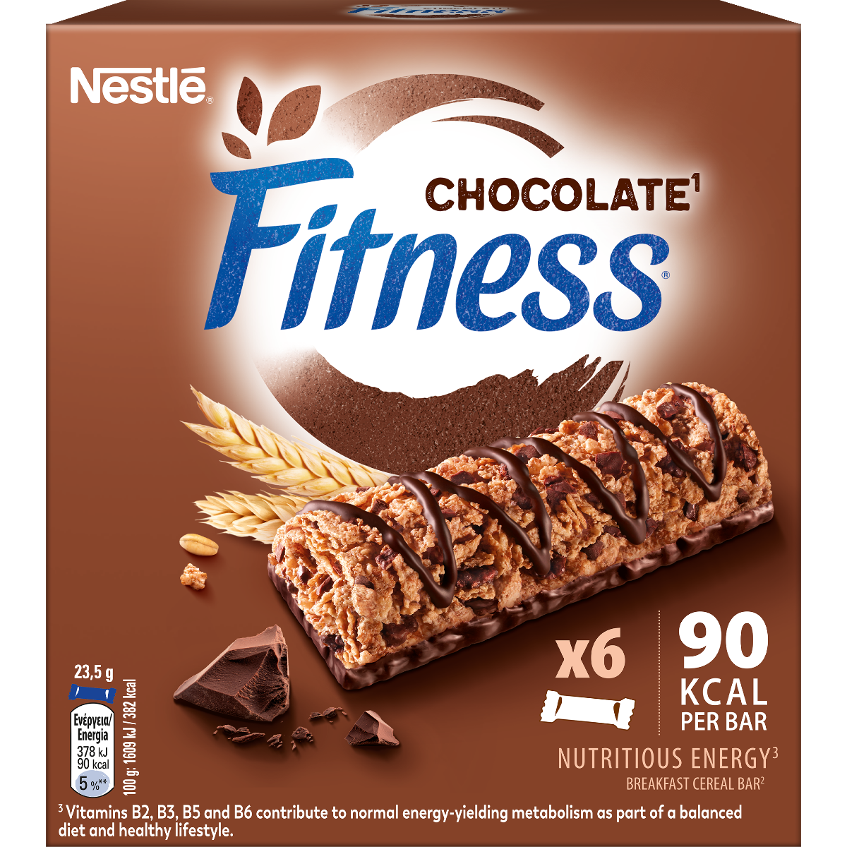 Take your energy with you with Nestle's Fitness® breakfast cereal bars. Enjoy the delicious chocolate taste of FITNESS® BARS CHOCOLATE! Made with whole wheat and whole grain oats and rich in B vitamins, they are the perfect mid-day choice for energy on the go and at just 91 calories!
