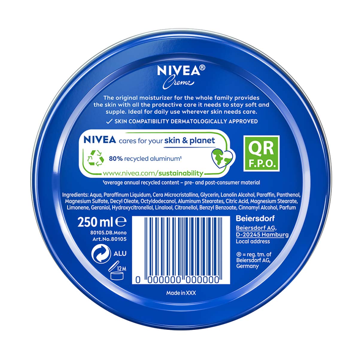 NIVEA Creme, the original moisturizer for the whole family, provides the skin with all the protection it needs to stay soft and supple. Ideal for daily use, whenever the skin needs care. NIVEA takes care of your skin & the planet. Skin compatibility dermatologically tested.