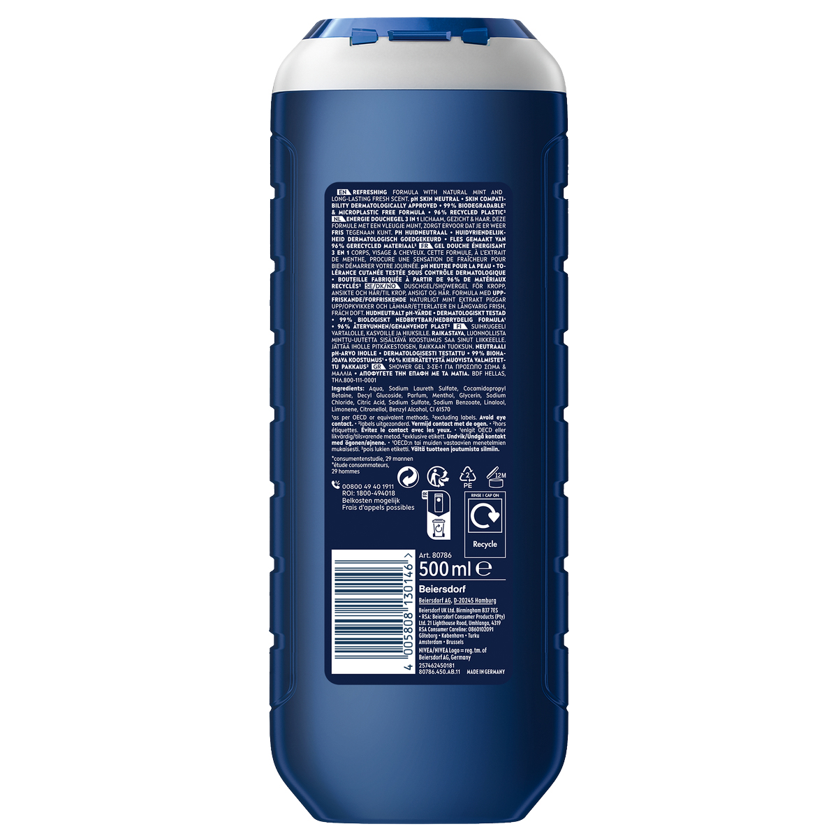 Let its cool and masculine Energy 24h Fresh Effect fragrance with mint extracts revitalize your senses, leaving you with a feeling of absolute stimulation and freshness on your skin. Recharge your batteries every time you shower! Apply the shower gel to wet skin and gently massage into your body , face and hair and then rinse thoroughly with plenty of water. It has 99% biodegradable formula and provides 24hours of freshness.