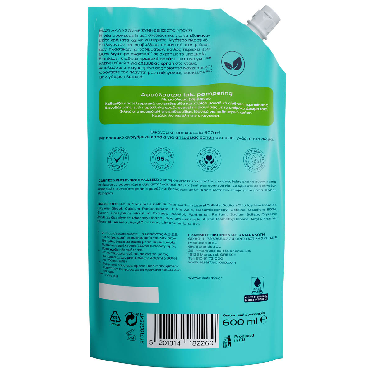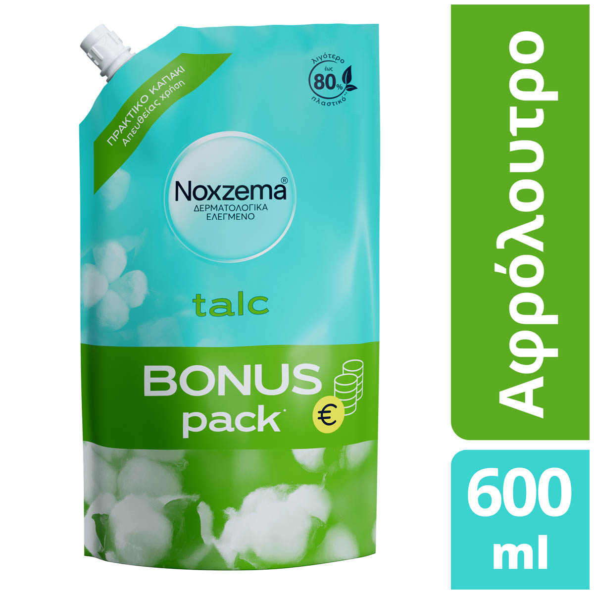 Our new packaging is designed to save you money and contain less plastic. By choosing it, you are making a significant contribution to reducing plastic waste, as it contains up to 80% less plastic** than a bottle. Plus, it has a handy lid that opens and closes easily for direct use in the shower. Enjoy your favourite Noxzema quality and take care of our planet by choosing packaging with less plastic! Effectively cleanses the skin and provides a unique feeling of nourishment & hydration, while revitalizing the senses with its wonderful talc scent. Dermatologically tested. Microbiome friendly. Ideal for daily use. Suitable for the whole family.