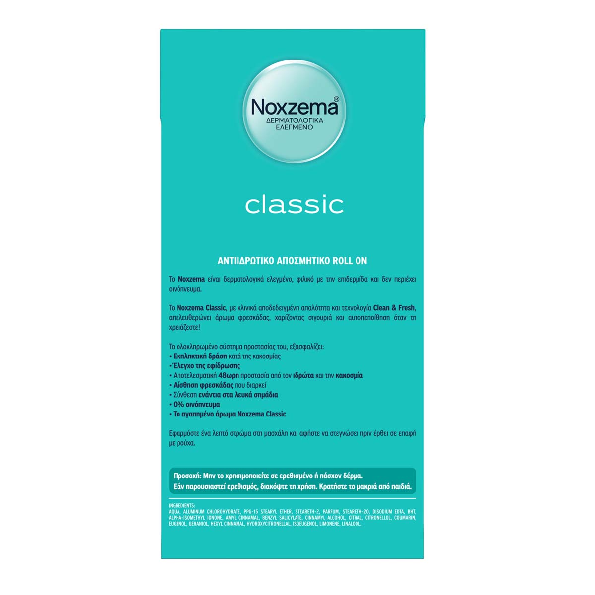 The integrated protection system of Noxzema Classic ensures sweat control, effective 48-hour protection from sweat and odor and a feeling of freshness that lasts.The antiperspirant deodorant roll on Noxzema Classic is dermatologically tested, skin-friendly, has a composition against white marks and does not contain alcohol.