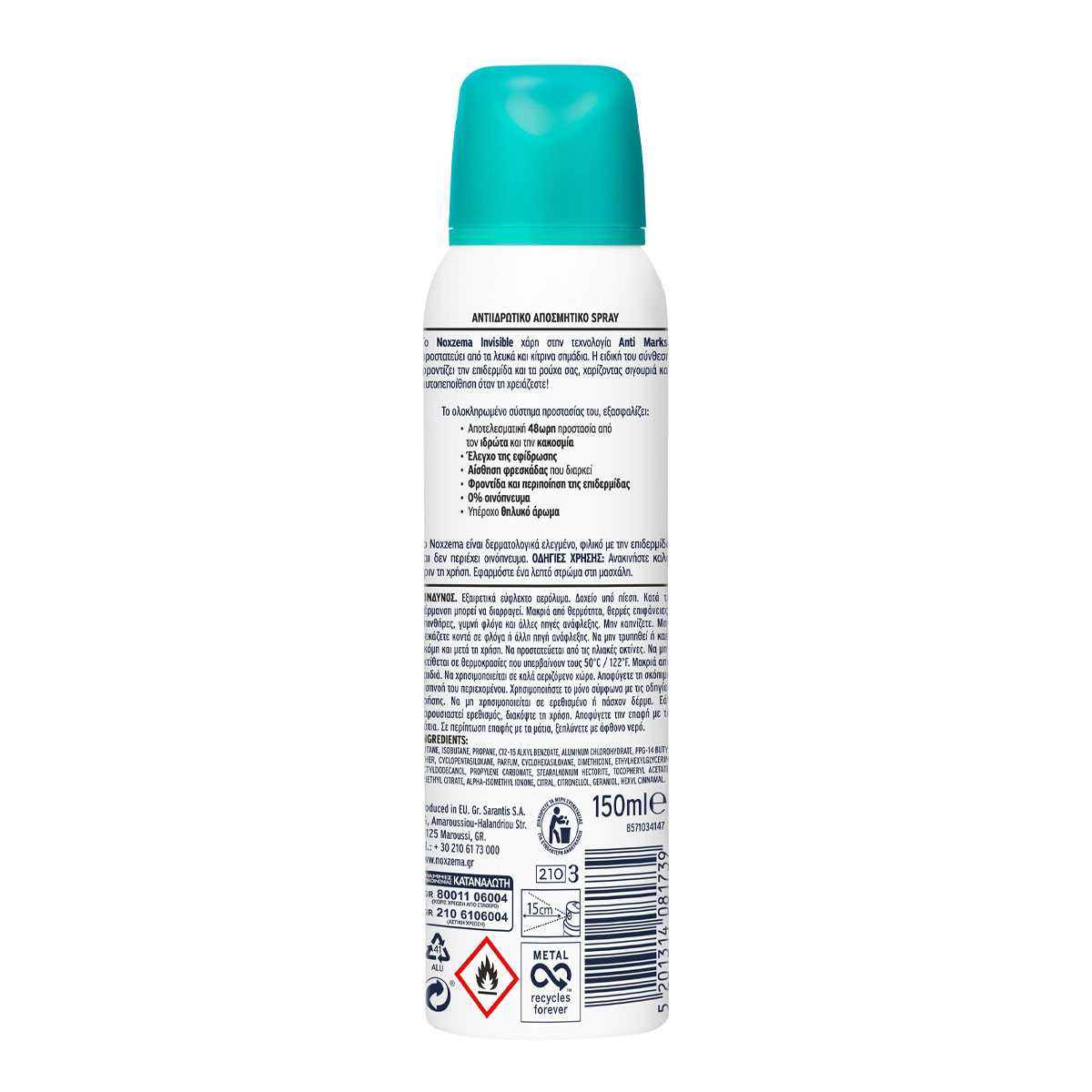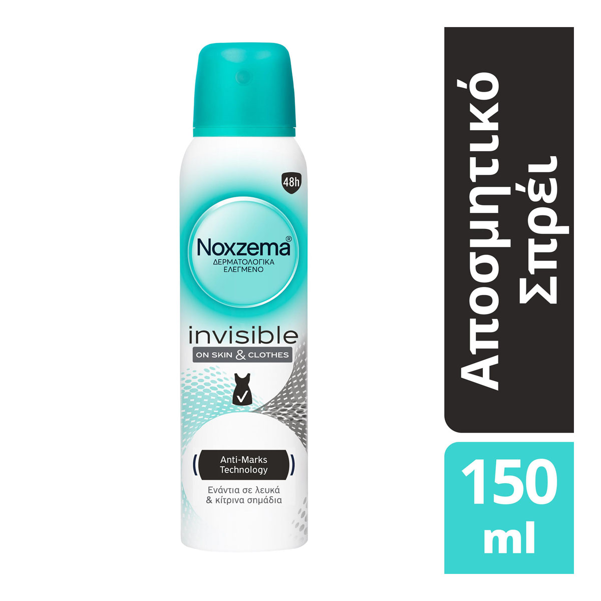 The Noxzema Invisible women's antiperspirant deodorant spray, thanks to the Anti-Marks technology, protects clothes from white and yellow marks. Its special formula cares for your skin and clothes, releases a long-lasting fresh scent and offers 48-hour protection against sweat and odour. It is dermatologically tested, skin-friendly, formulated against white marks, has a wonderful feminine fragrance and is alcohol-free. Apply a thin layer to the underarm area.