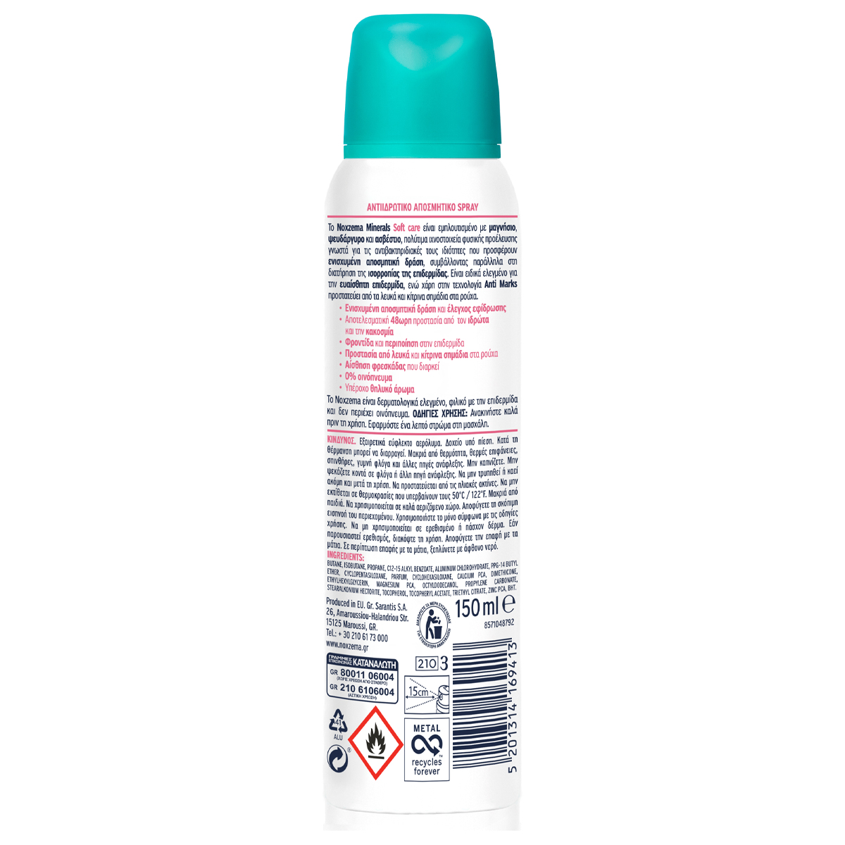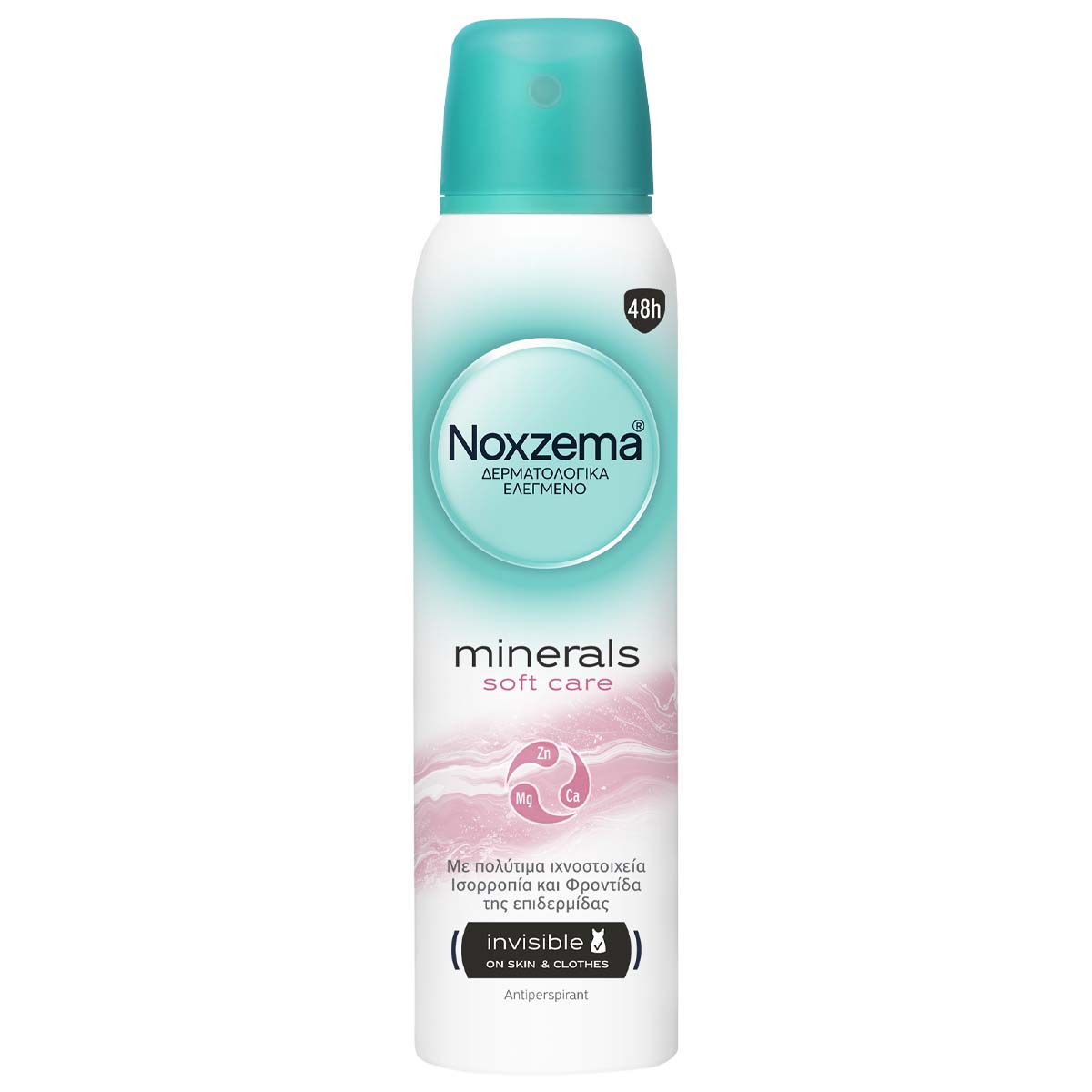 Noxzema Minerals Soft Care is enriched with magnesium, zinc & calcium, valuable trace elements of natural origin known for their antibacterial properties that offer enhanced deodorant action, while helping to maintain the balance of the skin. It offers effective 48-hour protection from sweat and odour and a feeling of freshness that lasts. It is specially tested for sensitive skin, and thanks to Anti Marks technology, it protects against white and yellow marks on clothes. It is dermatologically tested, skin-friendly, has a gentle feminine fragrance and is alcohol-free. Apply a thin layer to the underarm area.