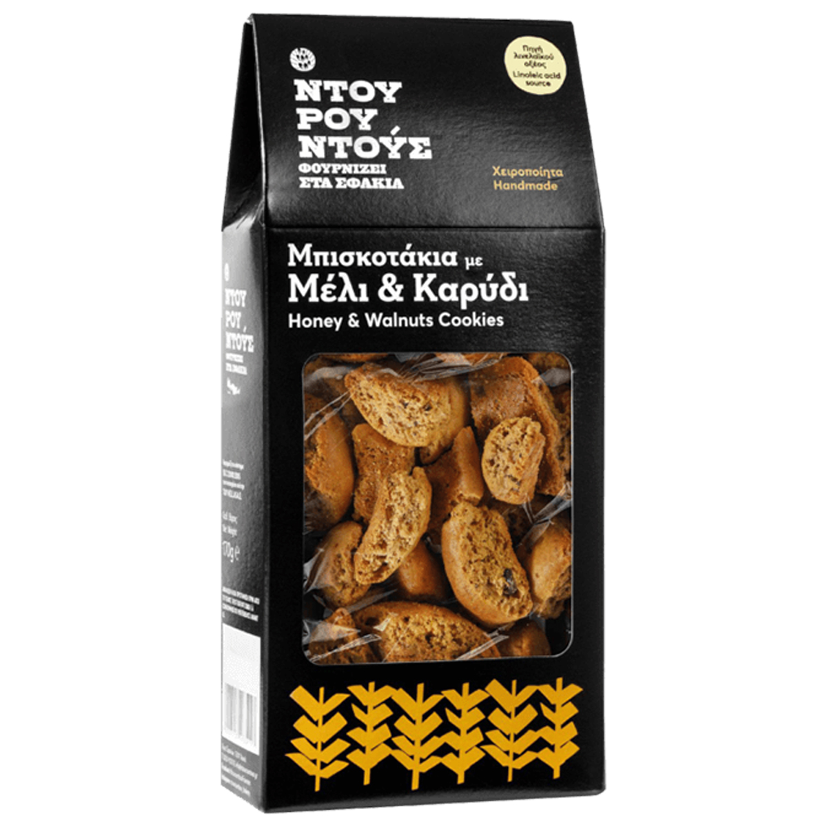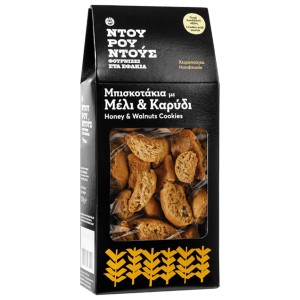Cookies with Honey and Walnut, made with soft wheat flour, tsikoudia, orange juice, cinnamon, vanilla and olive oil.