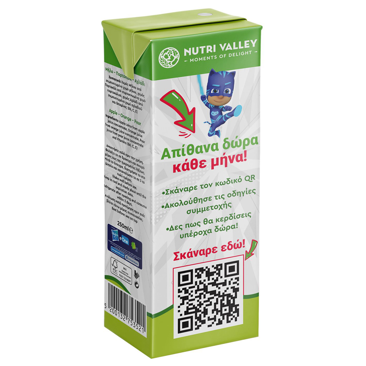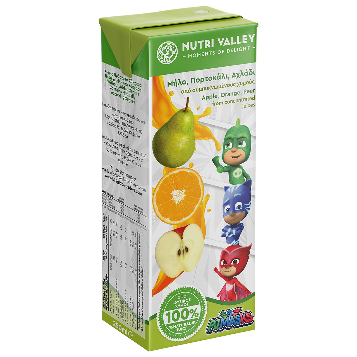 Children's juice Nutri Valley PJ Masks Apple, Orange, Pear. The delightful combination of 3 fruits is perfect to complement our little ones' breakfast or quench their thirst during a full day.