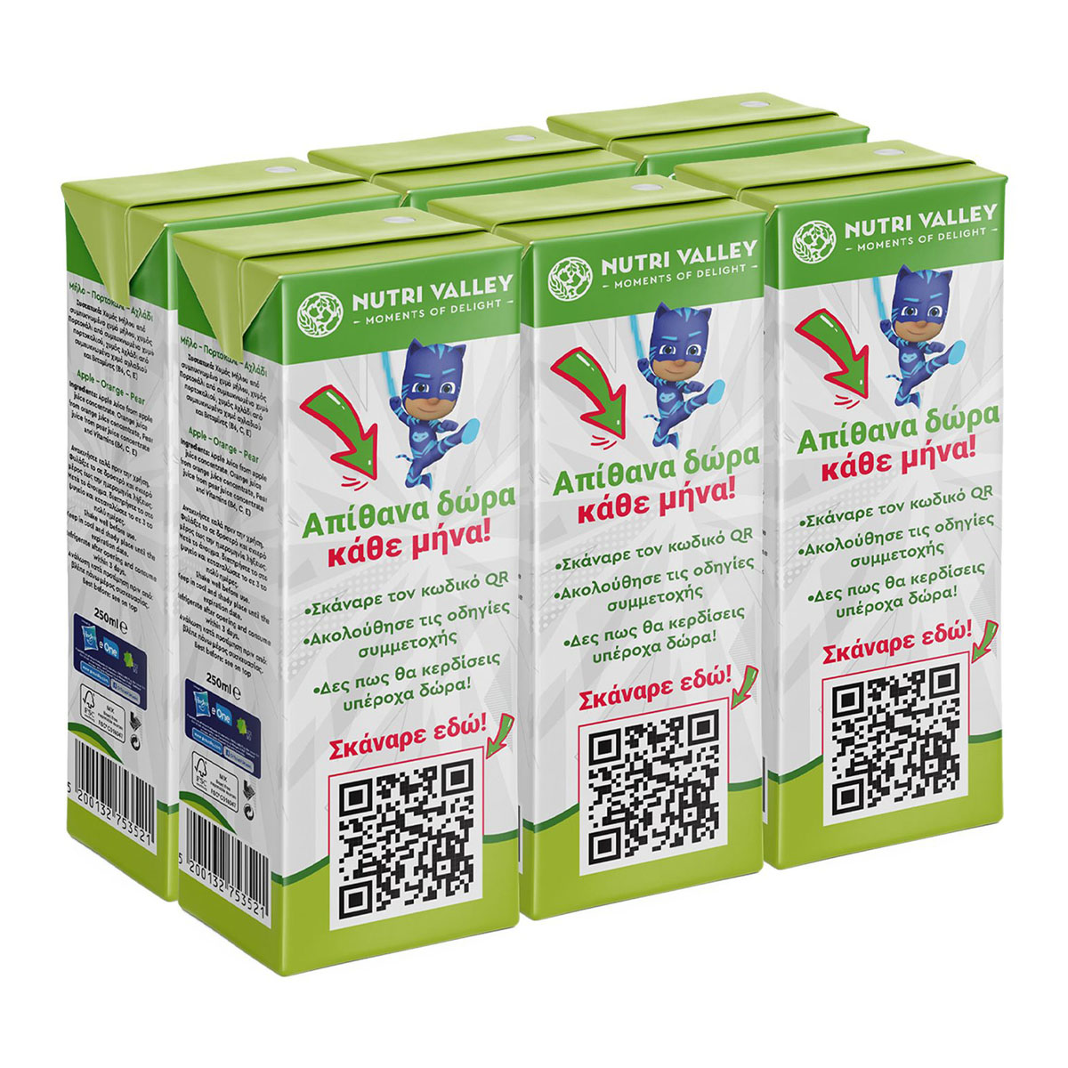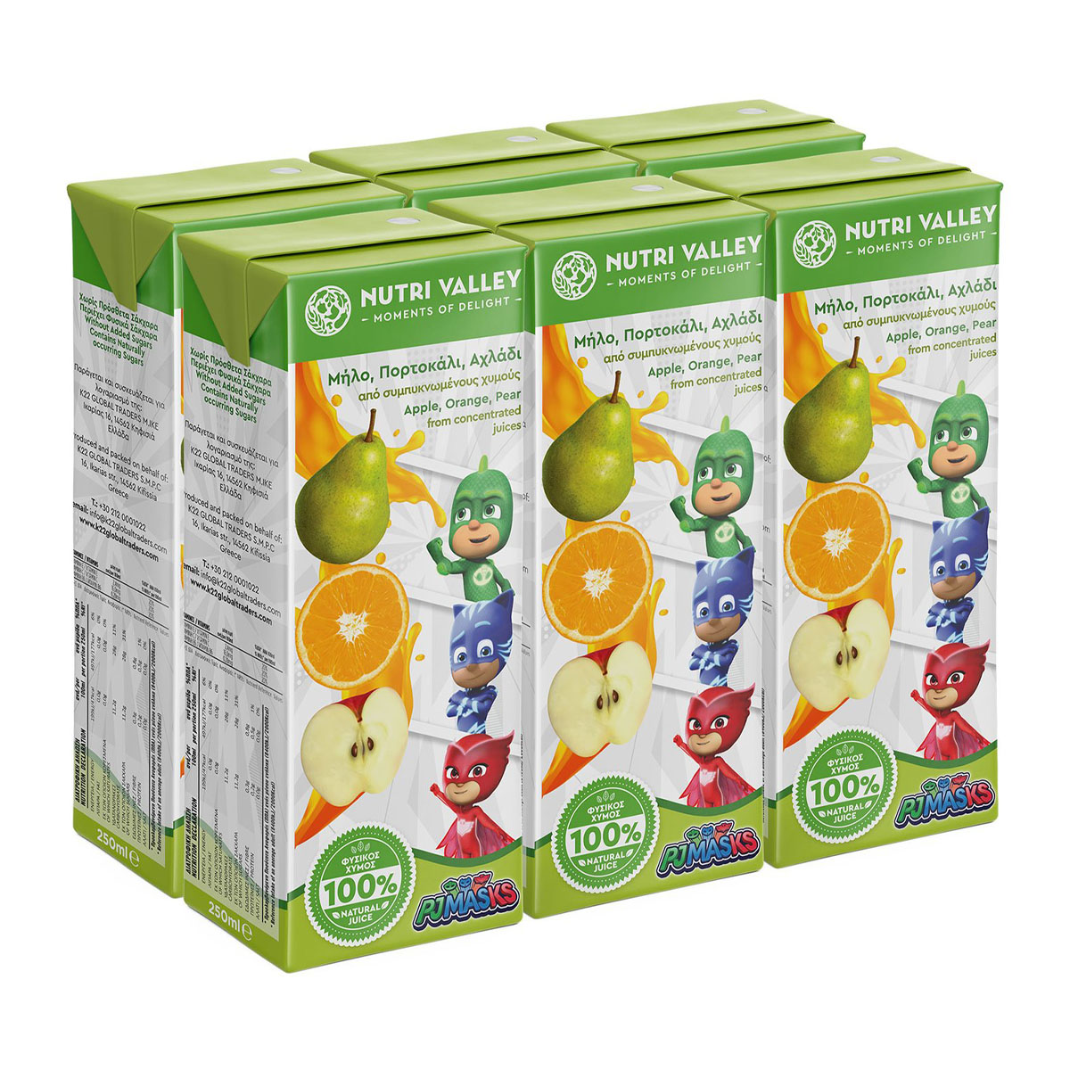 Children's juice Nutri Valley PJ Masks Apple, Orange, Pear 6x250ml. The delicious combination of 3 fruits is perfect to complement our little ones' breakfast or quench their thirst during a full day.