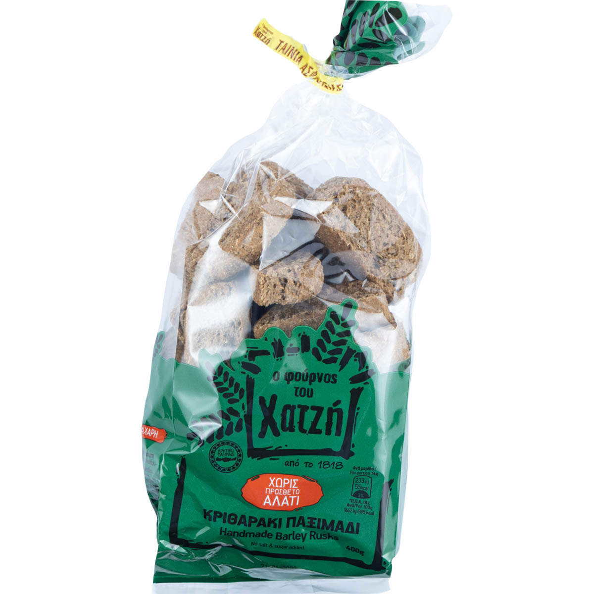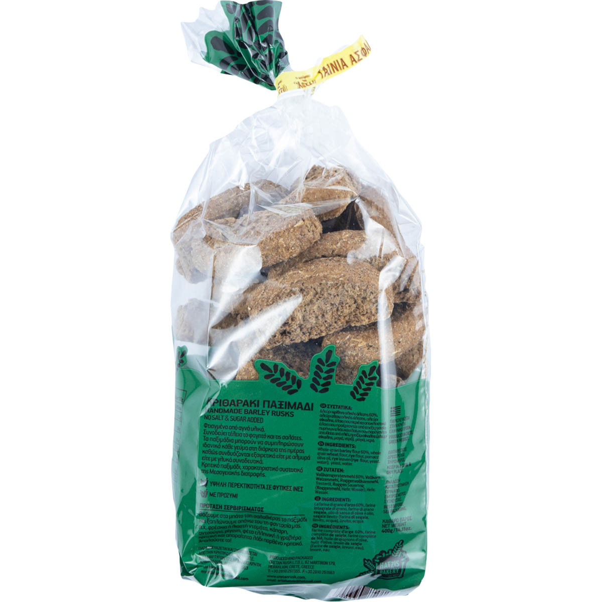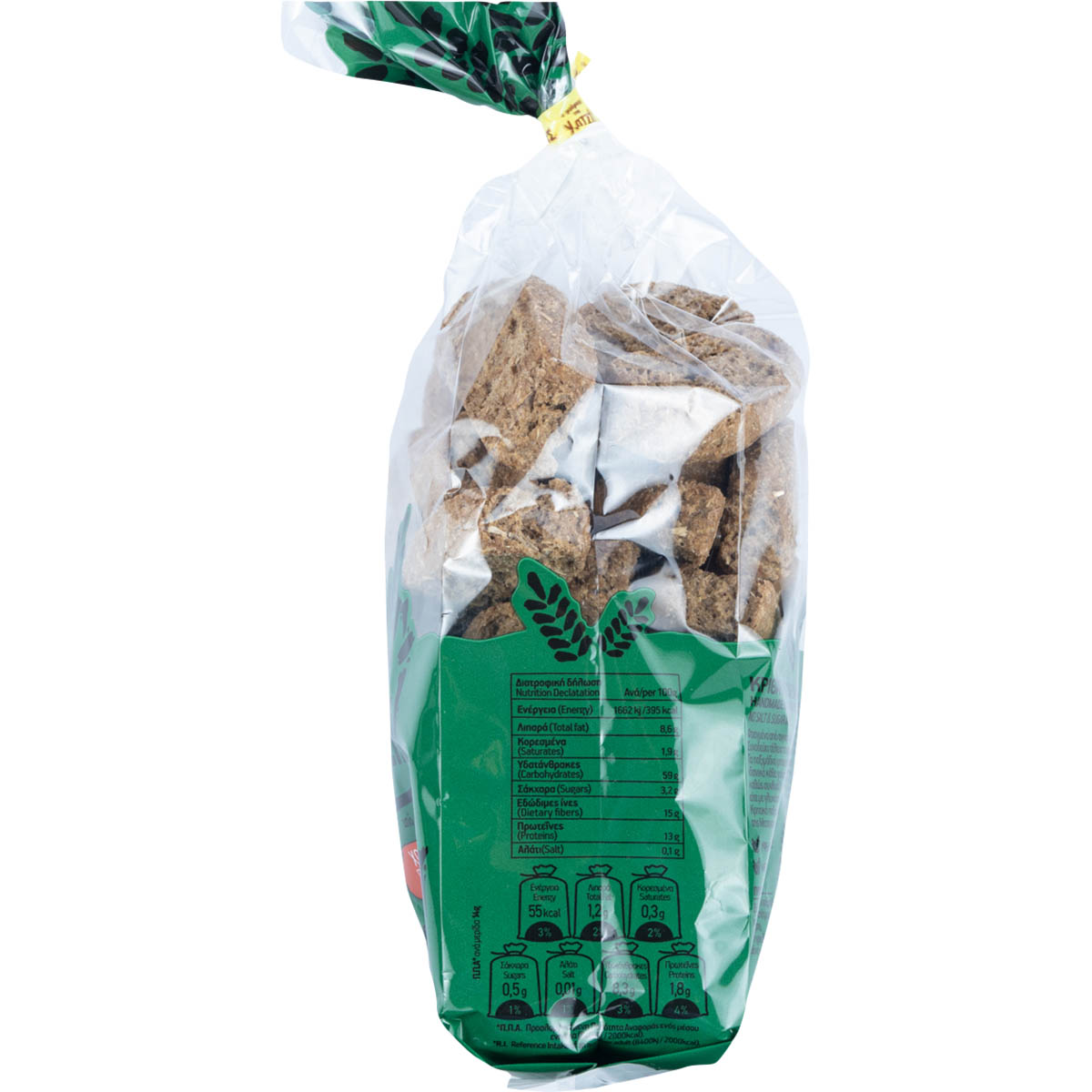 Made from pure ingredients and wholemeal flours. A special feature is the absence of salt in its production. Recommended for those who follow a low-sodium diet. Excellent taste of high nutritional value. Perfect accompaniment to all foods and salads. Cretan rusk, a typical ingredient of the Mediterranean diet.