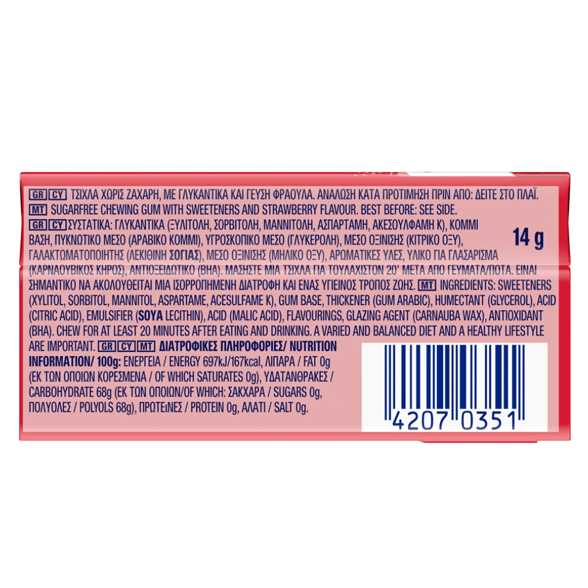 Chewing gum without sugar, with sweeteners, with Strawberry flavor. It is important to follow a balanced diet and a healthy lifestyle.