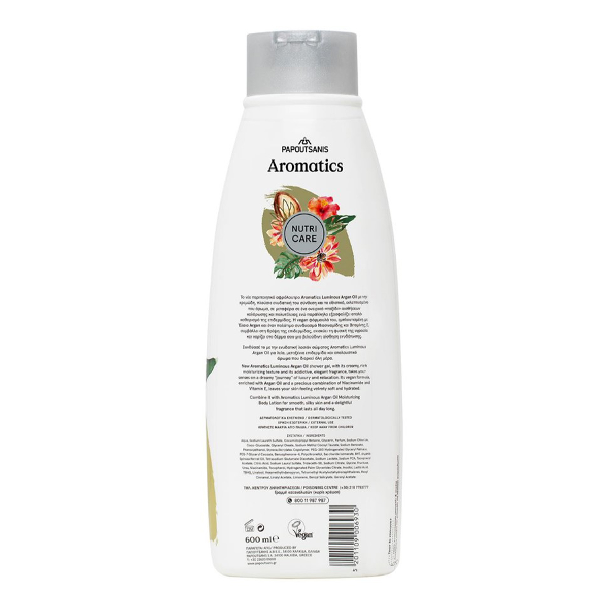 The new Aromatics Luminous Argan Oil shower gel with its creamy, rich moisturizing composition and addictive, sophisticated fragrance, takes you on a dreamy "journey" of sensations and luxury while ensuring gentle cleansing of the skin. Its vegan formula, enriched with Argan Oil and Nutricare, a combination of Niacinamide and Vitamin E, helps to nourish the skin, enhances its natural moisture and gives your skin a velvety feeling of hydration.