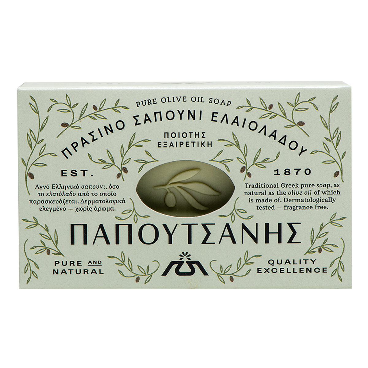 Solid soap with excellent cleansing action, provides complete hygiene for the skin. As pure as the olive oil from which it is made, the traditional green PAPOUTSANIS soap has been caring for the face, hair and body for 150 years. Dermatologically tested