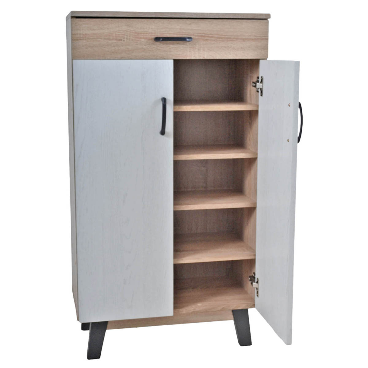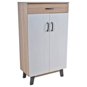 Wooden cabinet in natural color with shelf, white door and drawer, elegant legs and handle for easy use in black color. It is functional with a modern design and timeless style.