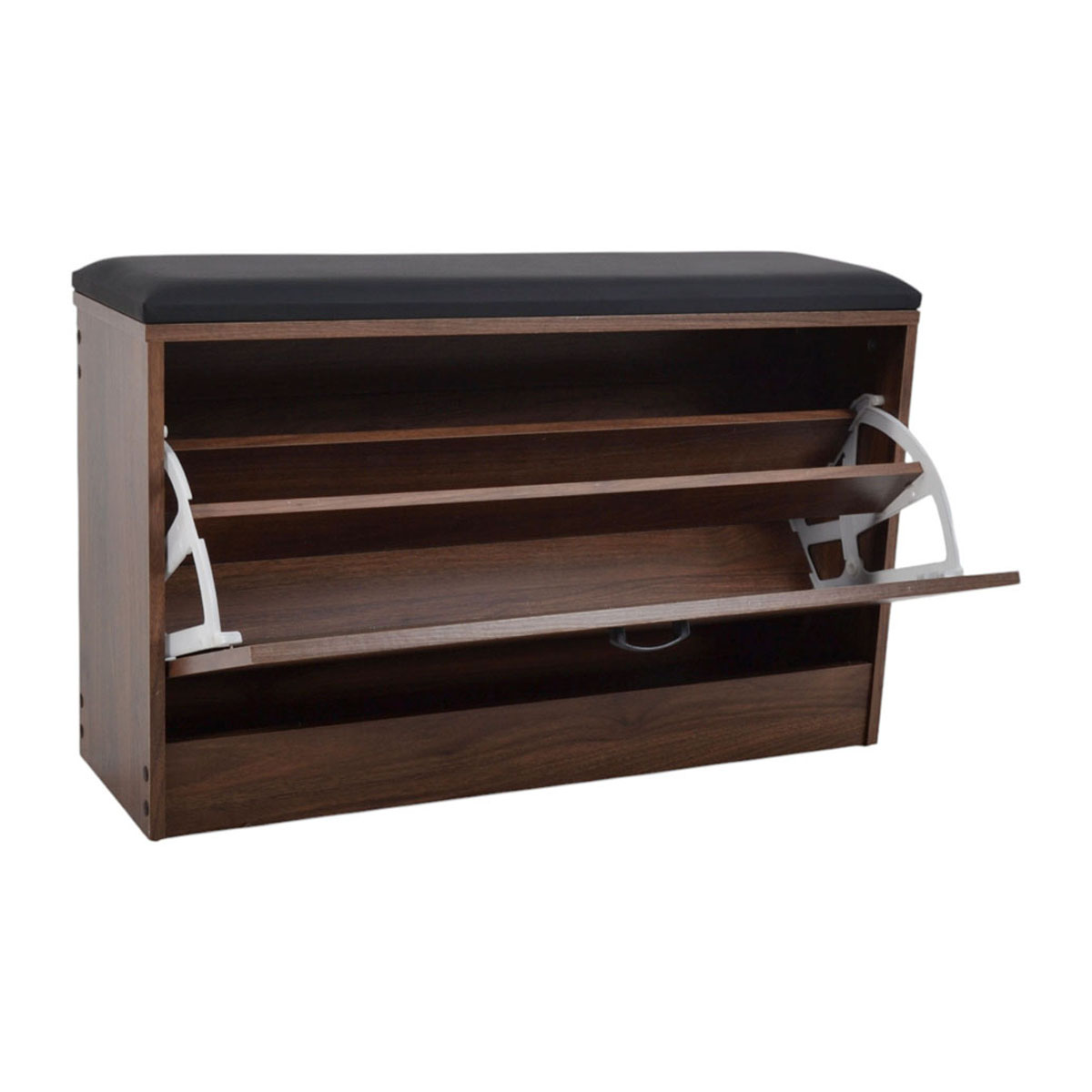 Παπουτσοθήκη ξύλινη με ένα διπλό ράφι ιδανική για να τακτοποιήσετε και να προστατέψετε τα παπούτσια σας. Διαθέτει ενσωματωμένο μαύρο μαξιλάρι και μπορεί να χρησιμοποιηθεί και ως σκαμπό. Αποτελεί πρακτική λύση για έπιπλο εισόδου.