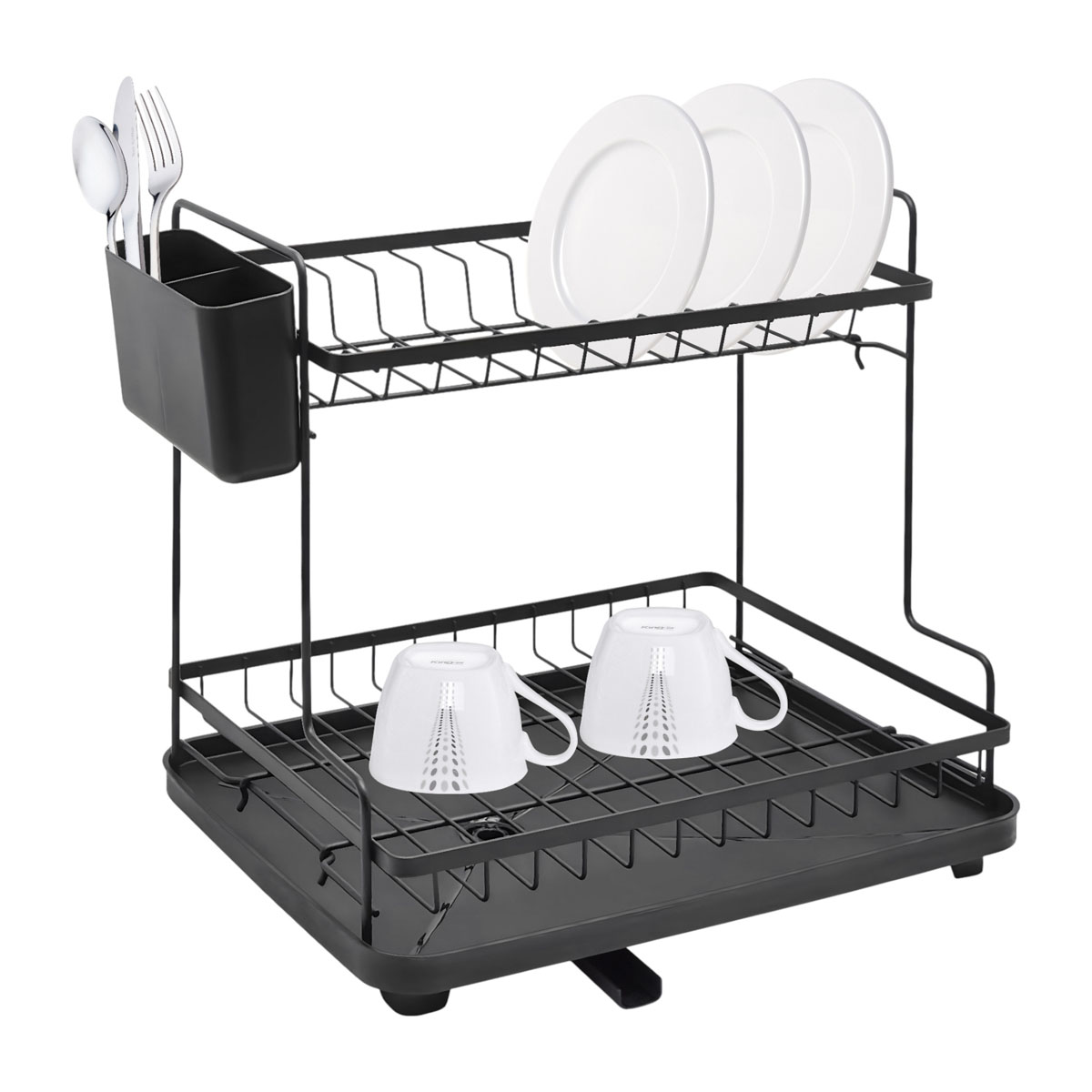 Πιατοθήκη διώροφη μεταλλική, η οποία διαθέτει πλαστικό δίσκο και κουταλοθήκη σε μαύρο ματ χρώμα. Το στόμιο αποστράγγισης εμποδίζει τη συγκέντρωση νερού μέσα στο δίσκο και κρατά τον πάγκο σας στεγνό και τακτοποιημένο. Πλένεται και καθαρίζεται εύκολα.
