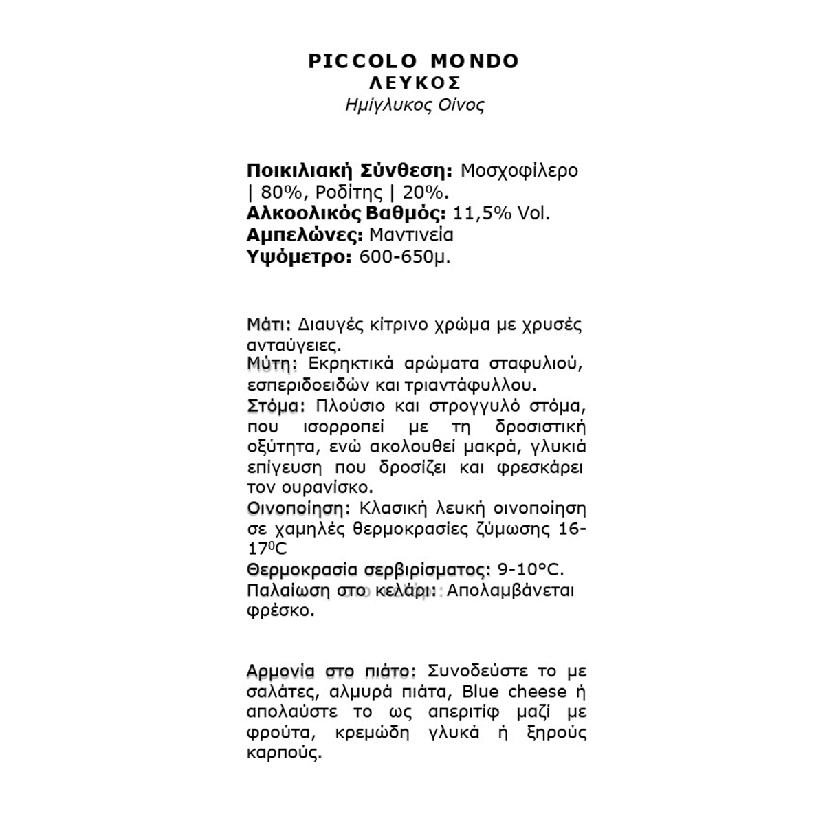 Vibrant, dark yellow color with golden hues. Explosive aromas of grapes, citrus and rose. Rich and rounded on the palate with intense acidity accompanied by a sweet aftertaste that refreshes and revitalizes the palate. Pairs well with salads, fruit tarts and light desserts. It is also served as an aperitif with fruit.