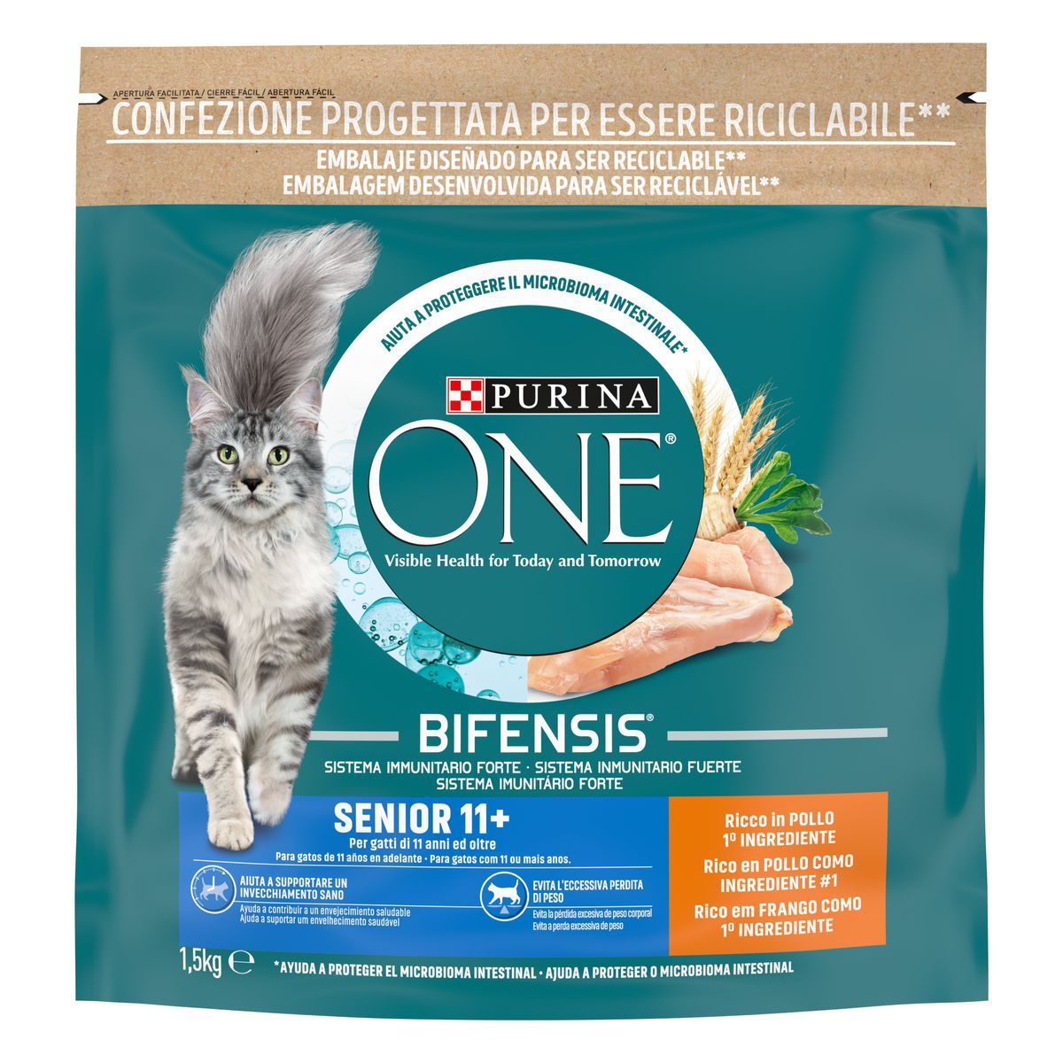 Η PURINA ONE® Senior 11+ είναι μια διατροφή ειδικά σχεδιασμένη ώστε να καλύπτει τις συγκεκριμένες ανάγκες που έχουν οι γάτες ηλικίας 11 ετών και πάνω.Το ισορροπημένο μικροβίωμα του εντέρου είναι απαραίτητο για την καλή υγεία της γάτας σας.Έχει άμεσο αντίκτυπο στο ανοσοποιητικό τους σύστημα.Το μικροβίωμα είναι ένα οικοσύστημα που περιέχει τρισεκατομμύρια μικροοργανισμούς που ζουν στο έντερο και είναι μοναδικοί σε κάθε γάτα.Η ισορροπία των μικροοργανισμών είναι σημαντική για να έχει θετική επίδραση στην πεπτική υγεία, το ανοσοποιητικό σύστημα και τη γενική ευεξία της γάτας σας.Η PURINA ONE® BIFENSIS® είναι μια διατροφική συνταγή με ωφέλιμα λειτουργικά βακτήρια: Λακτοβάκιλο, ο οποίος είναι επιστημονικά αποδεδειγμένο ότι ενισχύει το ανοσοποιητικό σύστημα της γάτας σας από μέσα προς τα έξω και βοηθά στην προστασία ενός υγιούς μικροβιώματος του εντέρου.Η Purina ONE® BIFENSIS® περιέχει υψηλής ποιότητας συστατικά, συμπεριλαμβανομένου του πρεβιοτικού: σικορέ, το οποίο καλλιεργεί τα καλά βακτήρια στο έντερο για να βελτιώσουν το μικροβίωμα του εντέρου της γάτας σας έτσι ώστε να διατηρήσει η γάτα σας την καλή υγεία.Τα ορατά αποτελέσματα για την υγεία της γάτας σας σήμερα και αύριο μπορείτε να τα δείτε από μια υγιή πέψη και ένα ισχυρό ανοσοποιητικό σύστημα έως ένα λαμπερό τρίχωμα.