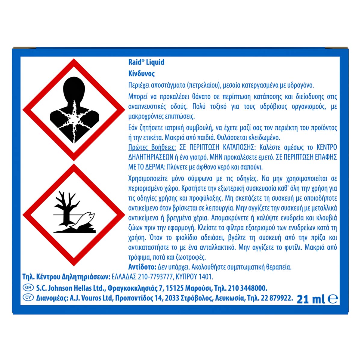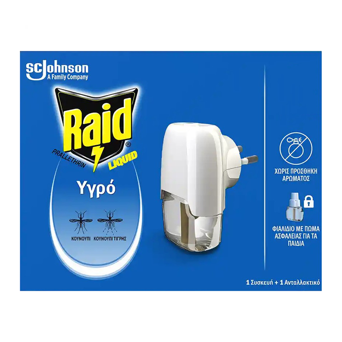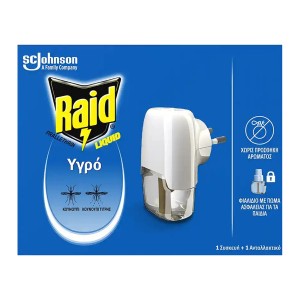The 21ml vial of Raid® Liquid effectively protects against mosquitoes (and the "Asian Tiger Mosquito") in an area of up to 30 sq.m. Its action lasts for 30 nights when used 8 hours a night. The device has a bright operation indicator. Raid® Liquid contains no fragrance.