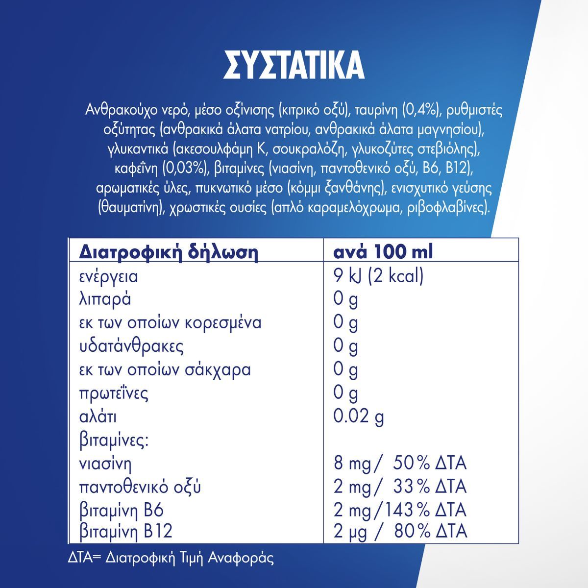 Carbonated water, acidifying agent (citric acid), taurine (0,4%), acidity regulators (sodium carbonate, magnesium carbonate), sweeteners (acesulfame K, sucralose, steviol glycosides), caffeine (0,03%), vitamins (niacin, pantothenic acid, B6, B12), flavourings, thickening agent (xanthan gum), flavour enhancer (thaumaturin), colouring agents (plain caramel colour, riboflavins).