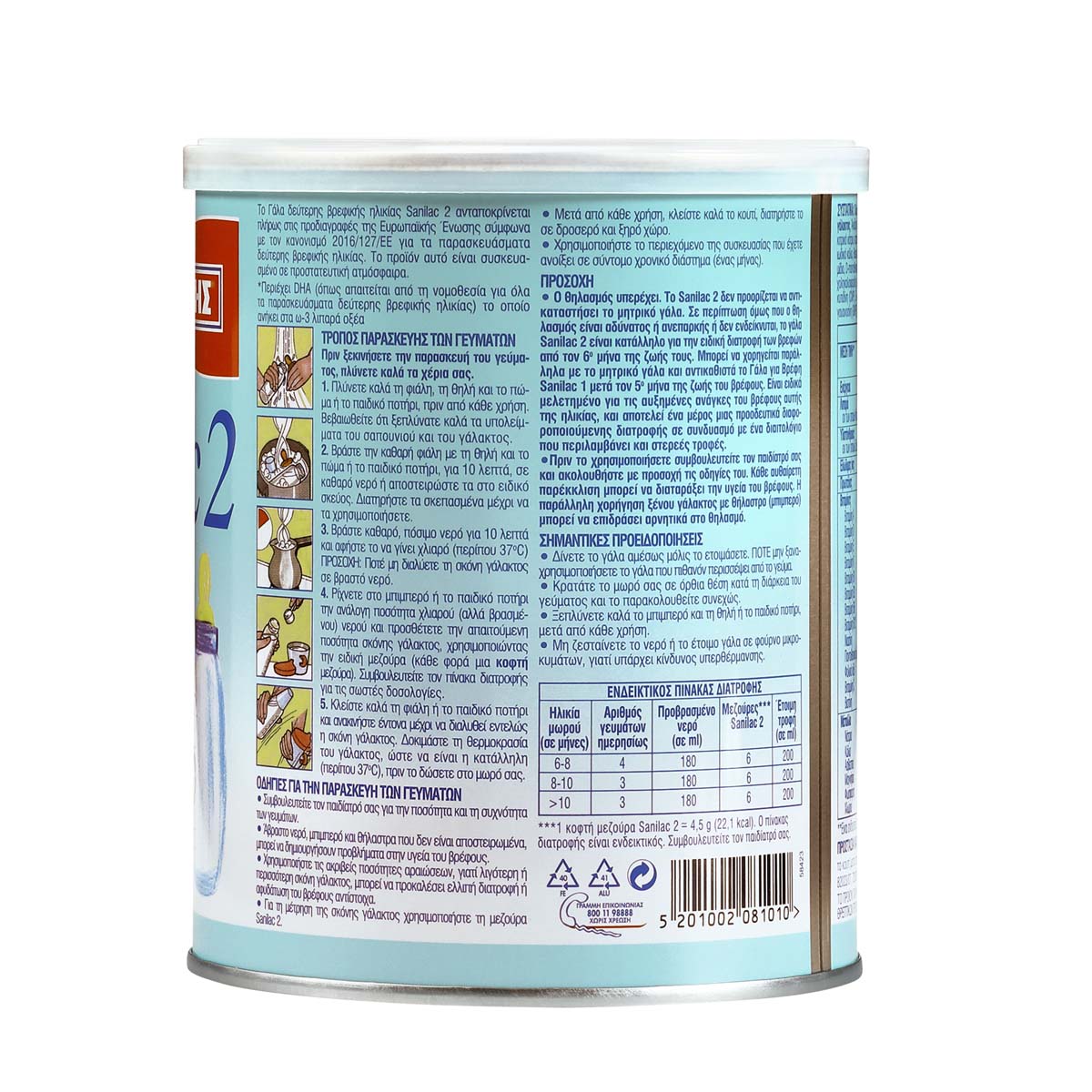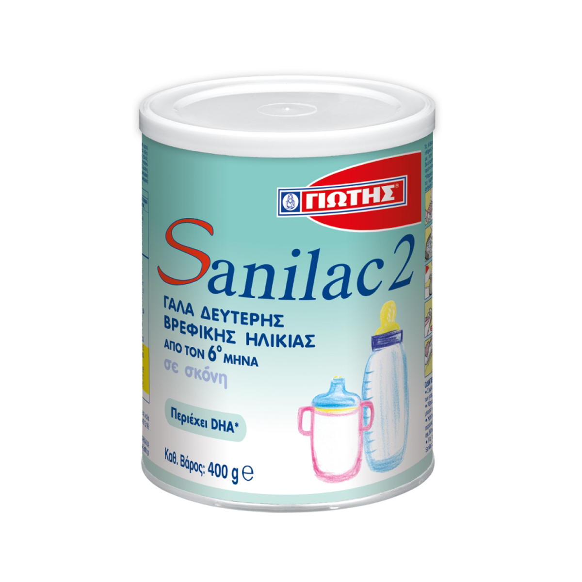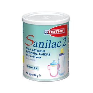 FROM MONTH 6 with prebiotic fibres Long-chain polyunsaturated fatty acids (LC-PUFAS) nucleotides. Sanilac 2 formulae fully comply with the European Union specifications in accordance with Directive 2006/141/EU on infant formulae and follow-on formulae. Sanilac 2 formula is characterised by: Ca/P:1,6 ratio. The composition of Sanilac 2 is enriched with: Iron. Iron: Long-chain polyunsaturated fatty acids (LC-RUFAS), taurine, prebiotic fibres (lacto-oligosaccharides), nucleotides. This product is packaged in a protective atmosphere.