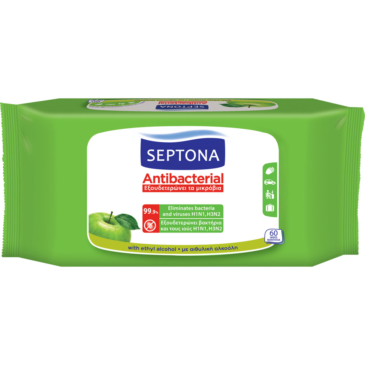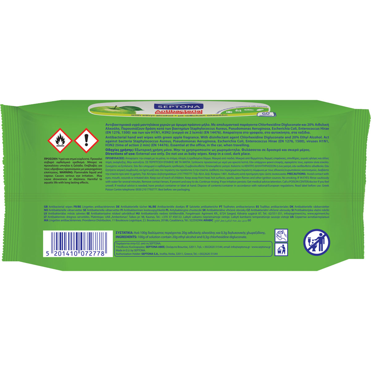 SEPTONA antibacterial hand wipes with green apple fragrance, neutralize germs and influenza H1N1 and H3N2 viruses, thanks to their composition with ethyl alcohol. They are the ideal solution for hands always clean, wherever you are: at the office, at school, in the car, on trips. They are also available in a pack of 15 wipes.