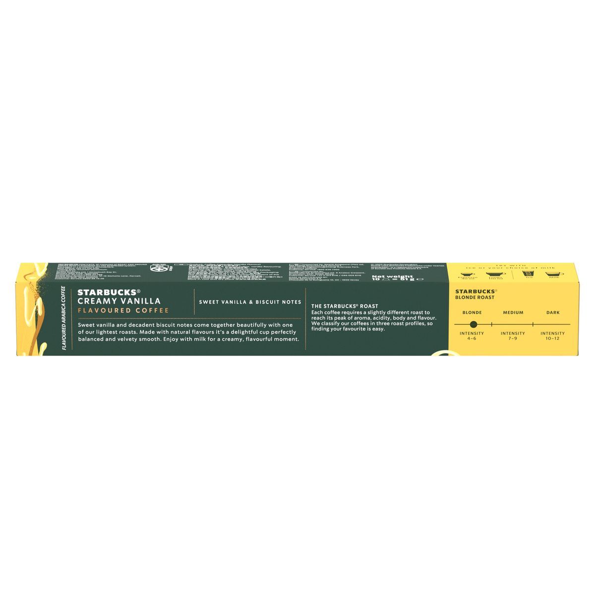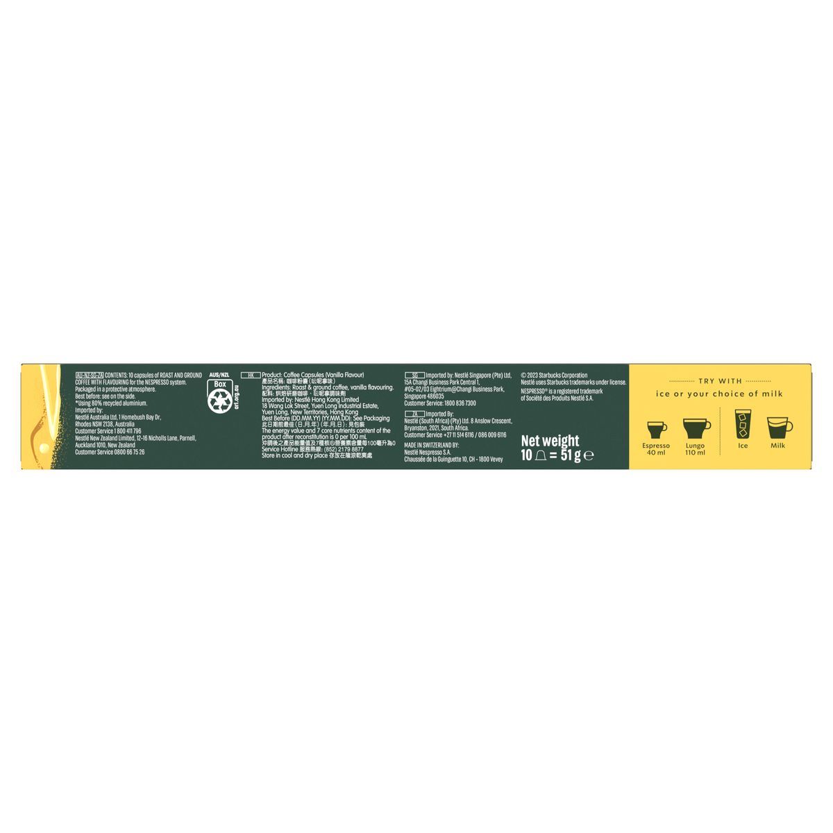 CONTAINS: 10 capsules of flavoured roasted and ground coffee for the NESPRESSO system. 100% Arabica. Packed in a protective atmosphere." "So simple. So enjoyable. Sit back and enjoy this mildly roasted Starbucks Blonde® coffee with a creamy vanilla flavor and hints of biscuit. Enjoy with or without milk for a sweet and indulgent cup of coffee. Perfect for an espresso (40m) or lungo (110ml) beverage. We make our capsules using 80% recycled aluminum. Aluminium can be recycled again and again and again. Compatible with Nespresso machine.