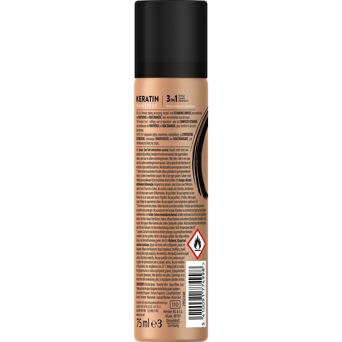 Με περισσότερα από 45 χρόνια ιστορίας στην περιποίηση μαλλιών, τα προϊόντα Syoss έχουν σχεδιαστεί για επαγγελματική απόδοση στο styling μαλλιών. Η 3 σε 1 φόρμουλα styling, περιποίησης, επανόρθωσης, για χτενίσματα μεγάλης διάρκειας με υγιή όψη - με σύμπλεγμα βιταμινών, συνδυασμό πανθενόλης και νιασιναμίδης, για ενδυνάμωση της δομής της τρίχας. Το Syoss Keratin Hairspray προστατεύει και ενδυναμώνει τα μαλλιά για άμεσα λεία, απαλά και λαμπερά μαλλιά χωρίς να αφήνει κολλώδη ή ορατά υπολείμματα. Παρέχει έως και 48 ώρες κράτημα, για φυσικό αποτέλεσμα.
