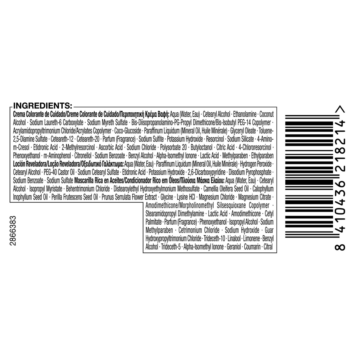 Hair Color, Toner, oxidative dyes:Aqua (Water, Eau), Cetearyl Alcohol, Ethanolamine, Coconut Alcohol, Sodium Laureth-6 Carboxylate, Sodium Myreth Sulfate, Glycine, Bis-Diisopropanolamino-PG-Propyl Dimethicone, Bis-Isobutyl PEG-14 Copolymer, Acrylamidopropyltrimonium Chloride, Acrylates Copolymer, Coco-Glucoside, Paraffinum Liquidum (Mineral Oil, Huile Minerale), Glyceryl Oleate, Toluene-2,5-Diamine Sulfate, Ceteareth-12, Ceteareth-20, Parfum (Fragrance), Sodium Sulfite, Potassium Hydroxide, Resorcinol, Sodium Silicate, 4-Amino-m-Cresol, Etidronic Acid, 2-Methylresorcinol, Ascorbic Acid, Sodium Chloride, Butyloctanol, Citric Acid, Polysorbate 20, 4-Chlororesorcinol, Phenoxyethanol, m-Aminophenol, Citronellol, Lactic Acid, Benzyl Alcohol, Alpha-Isomethyl Ionone, Sodium Benzoate, Methylparaben, Ethylparaben Developer:Aqua (Water, Eau), Paraffinum Liquidum (Mineral Oil, Huile Minerale), Hydrogen Peroxide, Cetearyl Alcohol, PEG-40 Castor Oil, Sodium Cetearyl Sulfate, Etidronic Ac