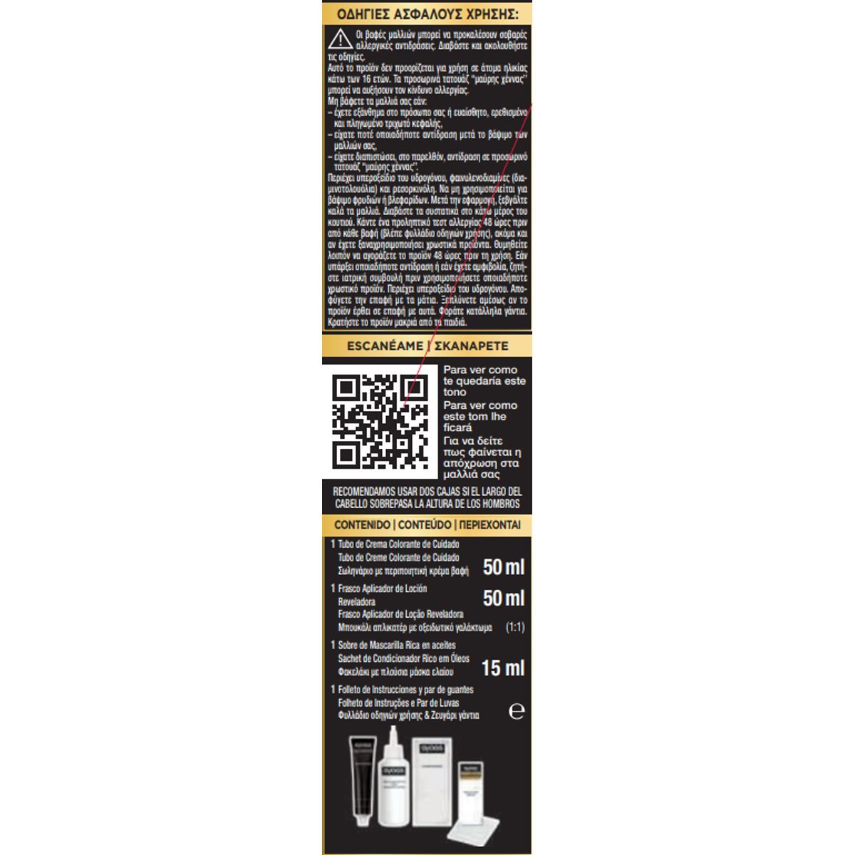 Οι βαφές μαλλιών μπορεί να προκαλέσουν σοβαρές αλλεργικές αντιδράσεις. Διαβάστε και ακολουθήστε τις οδηγίες. Αυτό το προϊόν δεν προορίζεται για χρήση σε άτομα ηλικίας κάτω των 16 ετών. Τα προσωρινά τατουάζ «μαύρης χέννας» μπορεί να σας αυξήσουν τον κίνδυνο αλλεργίας. Μη βάφετε τα μαλλιά σας εάν: έχετε εξάνθημα στο πρόσωπό σας ή ευαίσθητο, ερεθισμένο και πληγωμένο τριχωτό της κεφαλής, είχατε ποτέ οποιαδήποτε αντίδραση μετά το βάψιμο των μαλλιών σας, είχατε διαπιστώσει, στο παρελθόν, αντίδραση σε προσωρινό τατουάζ «μαύρης χέννας». Περιέχει υπεροξείδιο του υδρογόνου, φαινυλενοδιαμίνες (διαμινοτολουόλια), ρεσορκινόλη και αμμωνία. Να μην χρησιμοποιείται για βάψιμο φρυδιών ή βλεφαρίδων. Μετά την εφαρμογή, ξεβγάλετε καλά τα μαλλιά. Φοράτε κατάλληλα γάντια. Διαβάστε όλα τα συστατικά στο κάτω μέρος του κουτιού. Κάντε ένα προληπτικό τεστ αλλεργίας 48 ώρες πριν από κάθε βαφή (βλέπε φυλλάδιο), ακόμα και αν έχετε ξαναχρησιμοποιήσει χρωστικά προϊόντα. Θυμηθείτε λοιπόν να αγοράζετε το προϊόν 48 ώρες