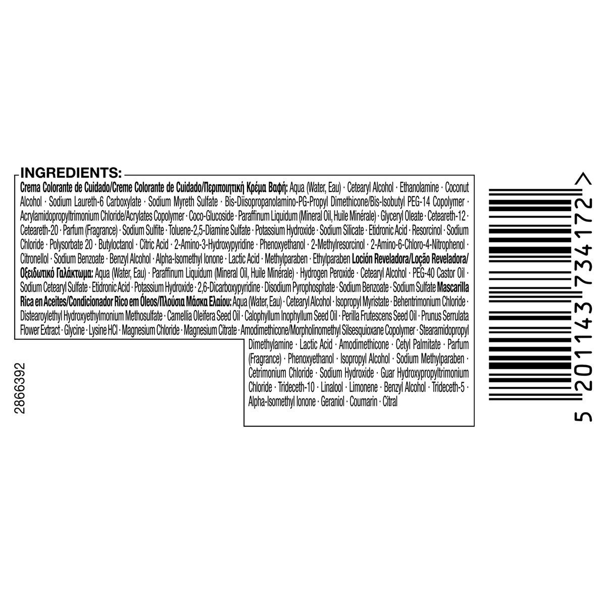 Περιποιητική Κρέμα Βαφή: Aqua (Water, Eau), Cetearyl Alcohol, Ethanolamine, Coconut Alcohol, Sodium Laureth-6 Carboxylate, Sodium Myreth Sulfate, Bis-Diisopropanolamino-PG-Propyl Dimethicone/Bis-Isobutyl PEG-14 Copolymer, Acrylamidopropyltrimonium Chloride/Acrylates Copolymer, Coco-Glucoside, Paraffinum Liquidum (Mineral Oil, Huile Minerale), Glyceryl Oleate, Ceteareth-12, Ceteareth-20, Parfum (Fragrance), Sodium Sulfite, Toluene-2,5-Diamine Sulfate, Potassium Hydroxide, Sodium Silicate, Etidronic Acid, Resorcinol, Sodium Chloride, Polysorbate 20, Butyloctanol, Citric Acid, 2-Amino-3-Hydroxypyridine, Phenoxyethanol, 2-Methylresorcinol, 2-Amino-6-Chloro-4-Nitrophenol, Citronellol, Sodium Benzoate, Benzyl Alcohol, Alpha-Isomethyl Ionone, Lactic Acid, Methylparaben, Ethylparaben.