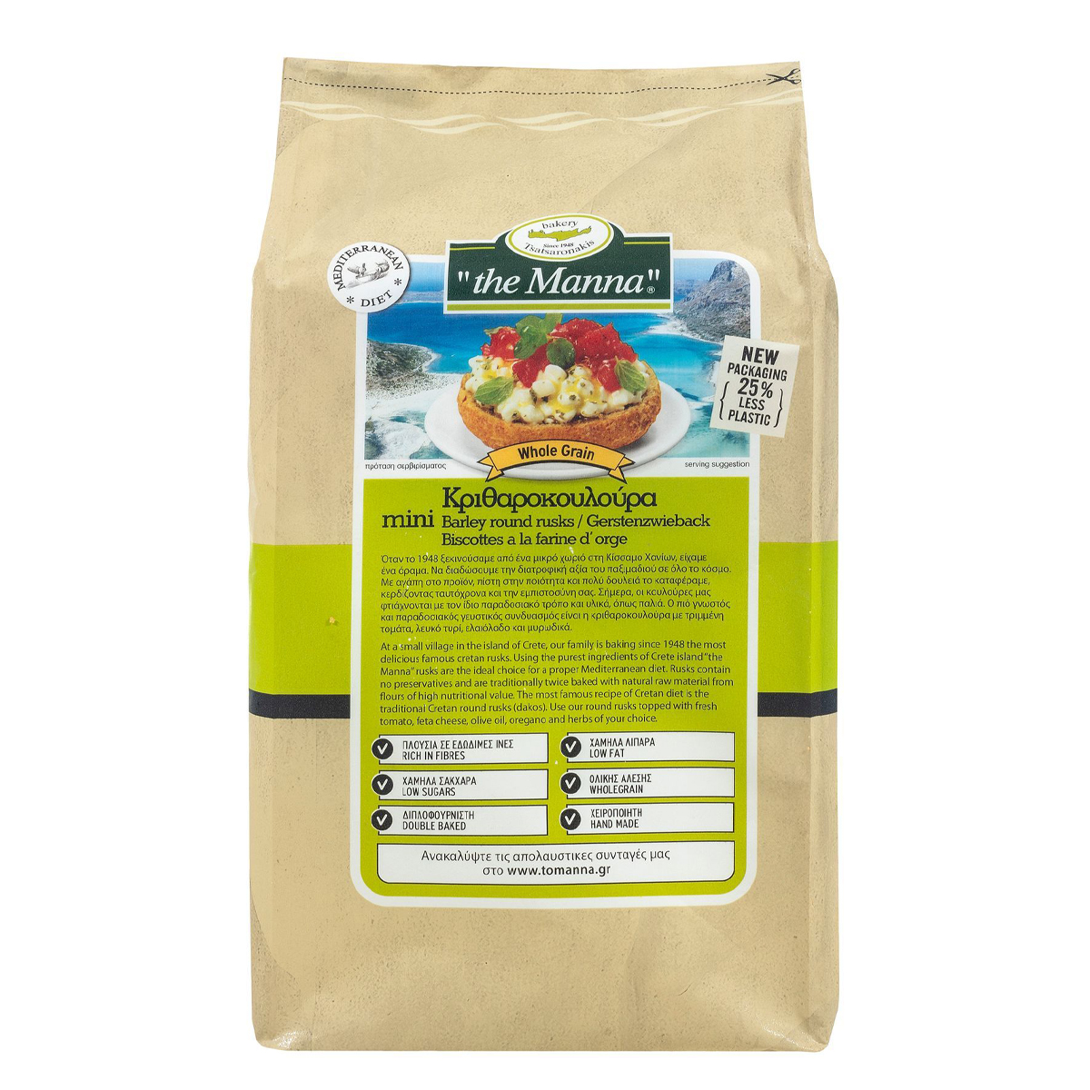 The traditional Cretan Dakos. The most famous dish of Crete that you can accompany it with tomato, cheese, olive oil, oregano. Pure Barley Kouloura, double-fried, with natural taste. A portion of the product has proportionally half the amount of salt of a portion of bread.