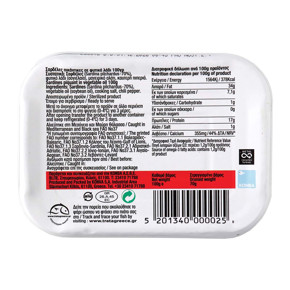 A top source of calcium (44% MFA), trace elements and Omega 3, TRATA sardines are a superfood of the Greek sea and the best ally against osteoporosis. They are lightly steamed with red hot peppers, offering a delicious dish with a special and spicy taste!