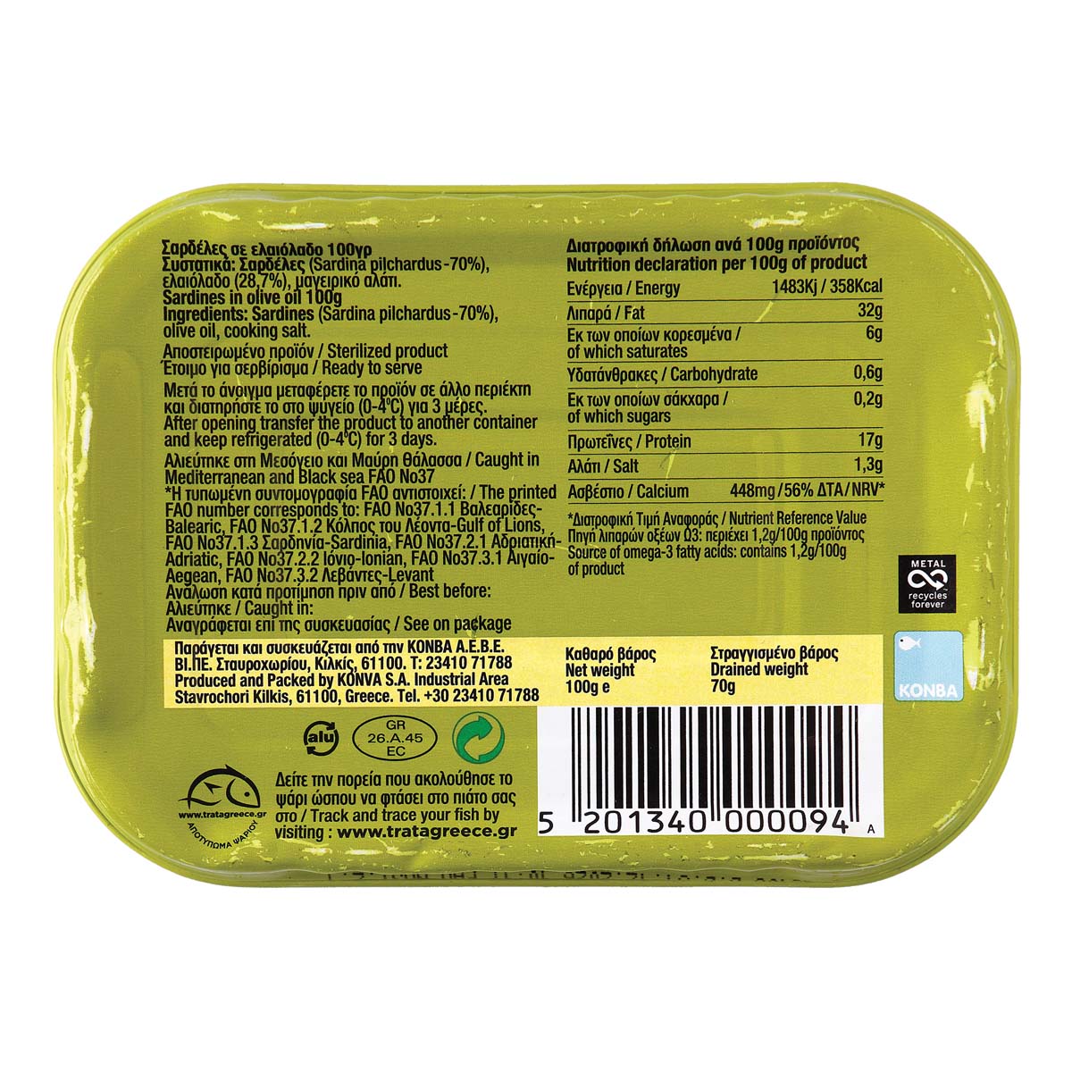 A top source of calcium (44% EPA), trace elements and Omega 3, TRATA sardines are a superfood of the Greek sea and the best ally against osteoporosis.The excellent Greek olive oil enhances their wonderful Mediterranean taste!