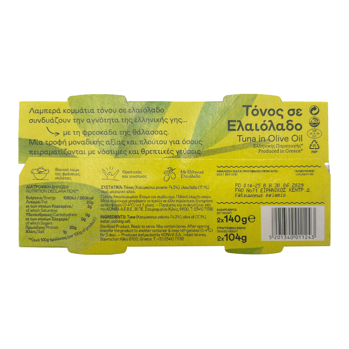 Tuna (65%), olive oil (27,5%), water, cooking salt.