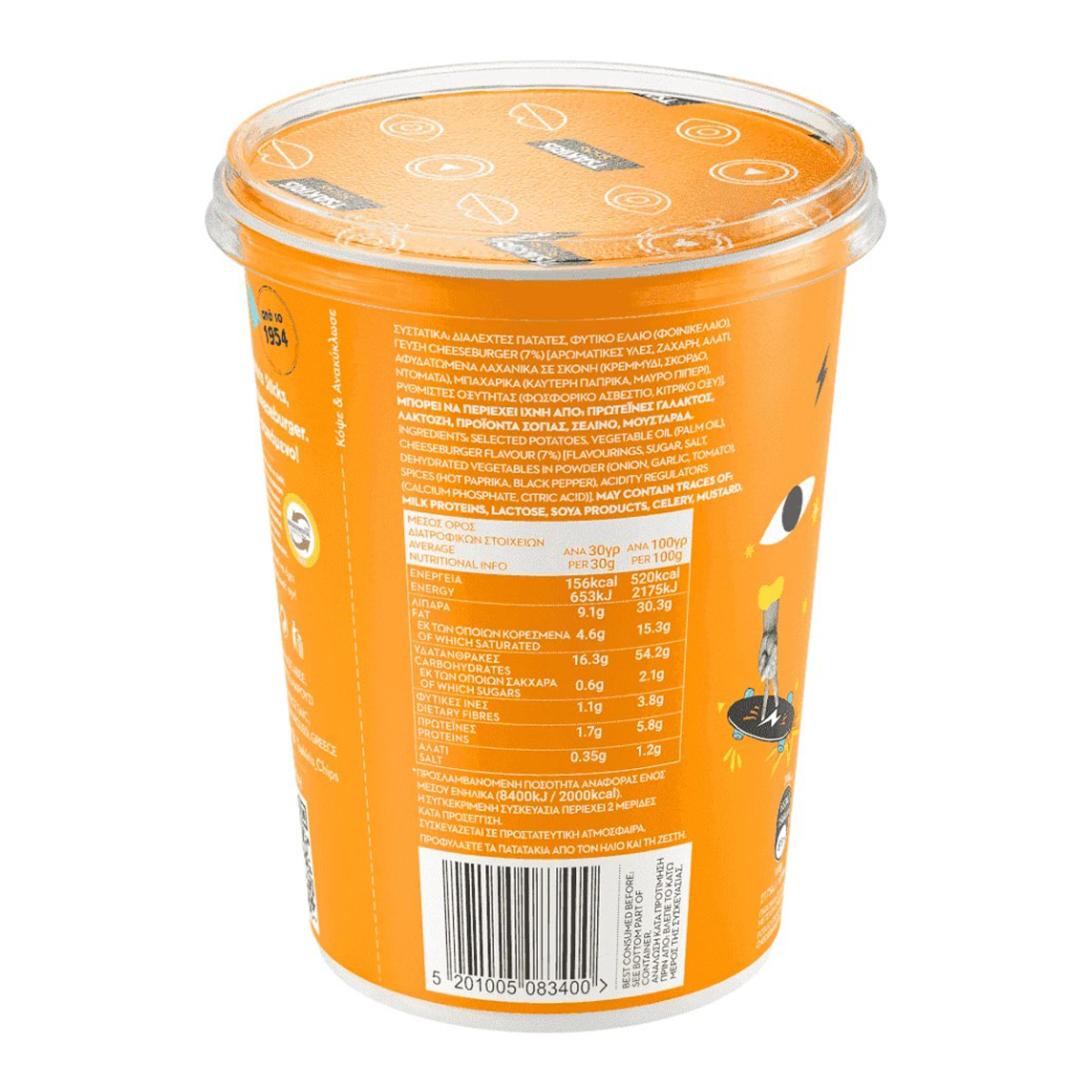 Διαλεχτές πατάτες, φυτικό έλαιο (φοινικέλαιο), γεύση cheeseburger (7%) [αρωματικές ύλες, ζάχαρη, αλάτι, αφυδατωμένα λαχανικά σε σκόνη (κρεμμύδι, σκόρδο, ντομάτα), μπαχαρικά (καυτερή πάπρικα, μαύρο πιπέρι), ρυθμιστές οξύτητας (φωσφορικό ασβέστιο, κιτρικό οξύ)].