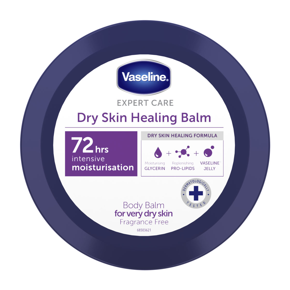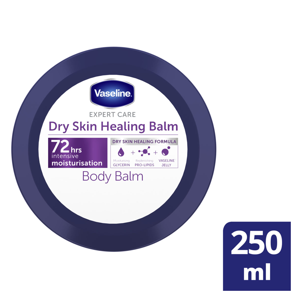 Vaseline Dry Skin Healing moisturizing body balm helps to repair very dry skin from the first use, with hydration that lasts for up to 72 hours. Enriched with moisturizing glycerin, replenishing pro-lipids and Vaseline Petroleum Jelly micro-droplets, it hydrates and absorbs quickly, leaving skin softer and more protected.