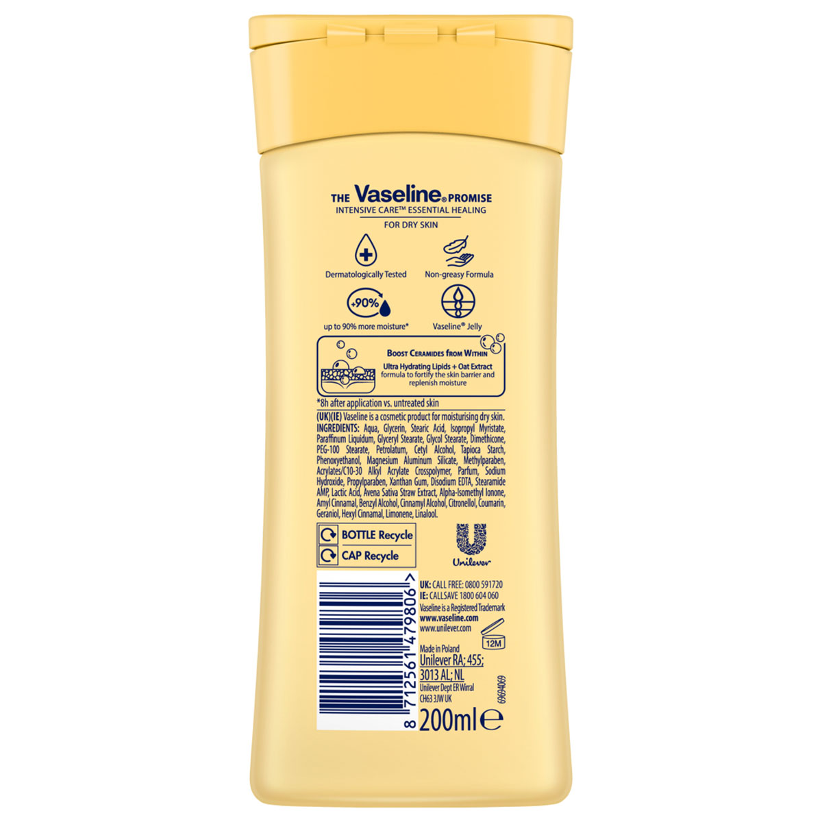 Vaseline Essential Healing moisturizing body lotion, with Vaseline Petroleum Jelly micro-droplets, moisturizes and helps protect against dryness for up to 3 weeks.