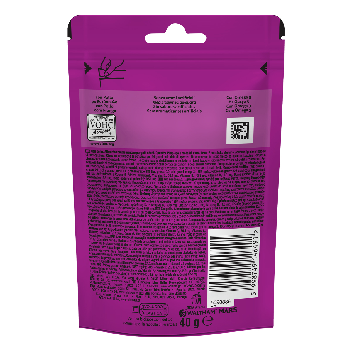 WHISKAS® Dentabites healthy treats for the cat's teeth 40g. WHISKAS® DentaBites are clinically proven to reduce tartar formation in cat teeth. Due to its special shape and texture, when offered daily, WHISKAS® DentaBites helps to care for your cat's teeth. Complementary food for adult cats.