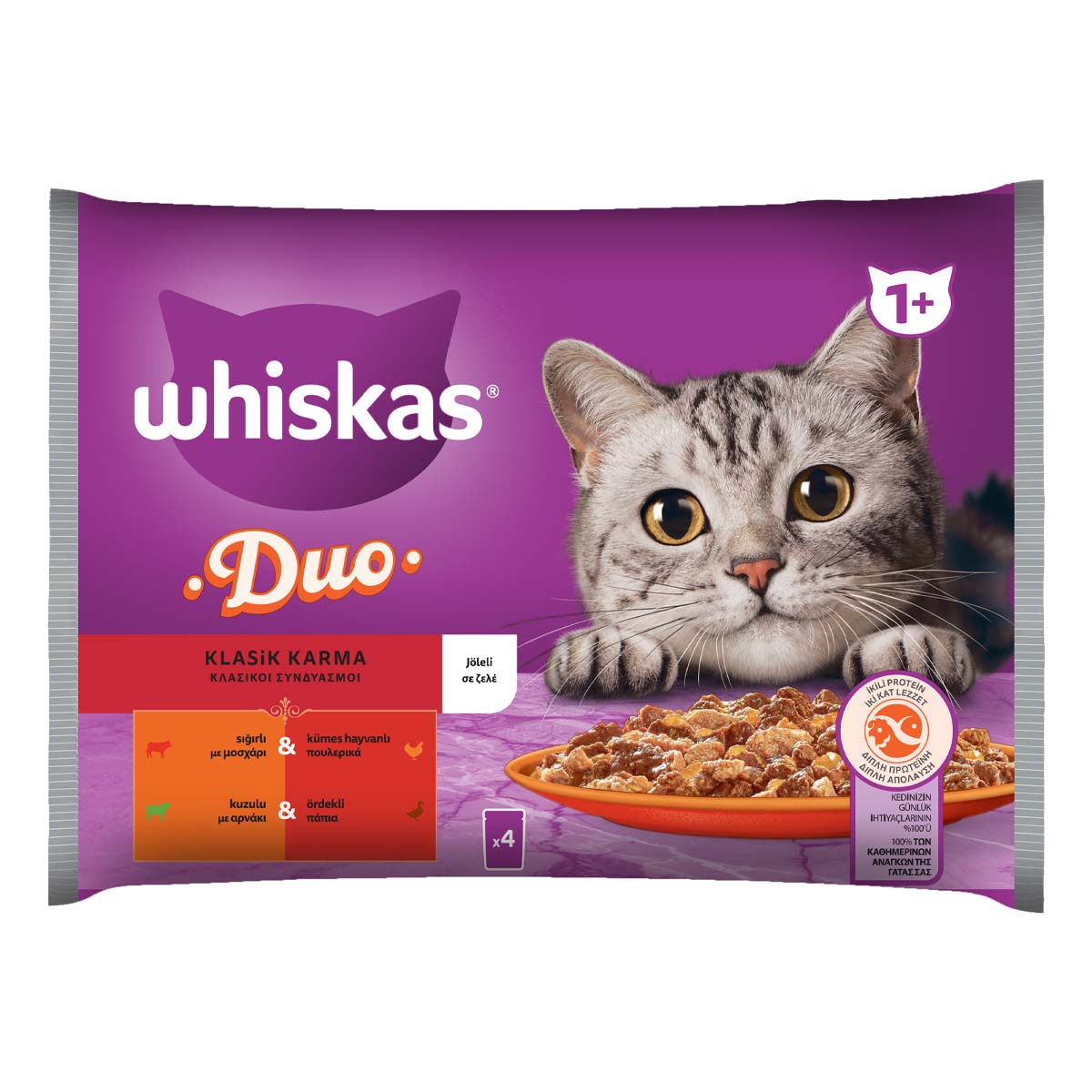 At Whiskas® we know very well what your cat needs and loves. That's why our sachets are nutritionally complete and balanced, so you can give your cat the best possible care. Our delicious jelly recipes combine two of their favourite flavours into one great meal, without compromising on nutrients. Each succulent DUO recipe is made with two irresistible flavors for a delicious treat that even the pickiest of cats won't resist! For a sure-fire purr.