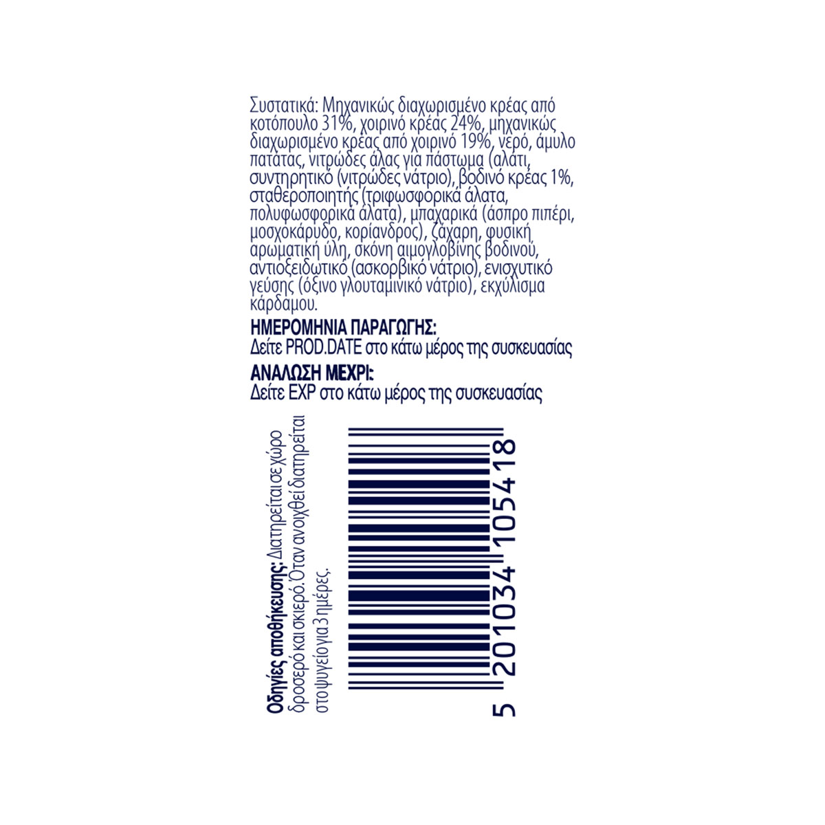Pork (44%), mechanically separated chicken (32%), water, starch, salt, beef (1.1%), stabilizers (triphosphoric acid salts and polyphosphates), seasonings, sugar, spice extract, beef haemoglobin powder, antioxidant (ascorbate, sodium), flavour enhancer (monosodium glutamate), preservative (sodium nitrite).