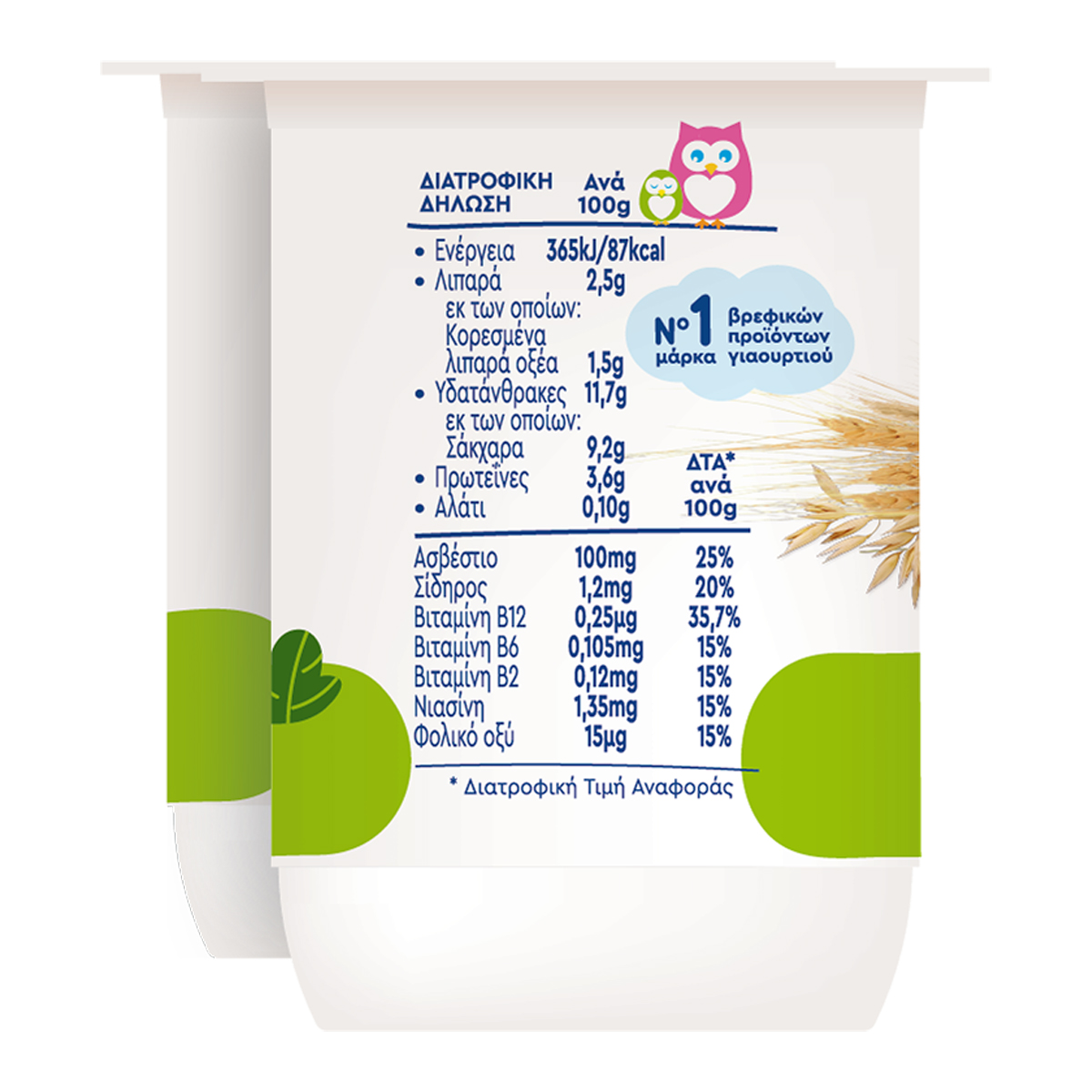 Φρέσκο άπαχο ΓΑΛΑ αγελάδος - ΑΝΘΟΓΑΛΑ - πρωτεΐνη ΓΑΛΑΚΤΟΣ 78.5%, φρουκτόζη, εκχύλισμα σταφυλιού, άμυλο, δημητριακά (ΣΙΤΑΡΙ, ρύζι, ΚΡΙΘΑΡΙ, ΒΡΩΜΗ, ΣΙΚΑΛΗ) 1.24%, αρωματική ύλη, γαλακτικός σίδηρος, μίγμα βιταμινών (Β6, νιασίνη, φολικό οξύ, C), καλλιέργεια ΓΙΑΟΥΡΤΗΣ. Λιπαρά 2,4%, ολικά στερεά 19,9%.