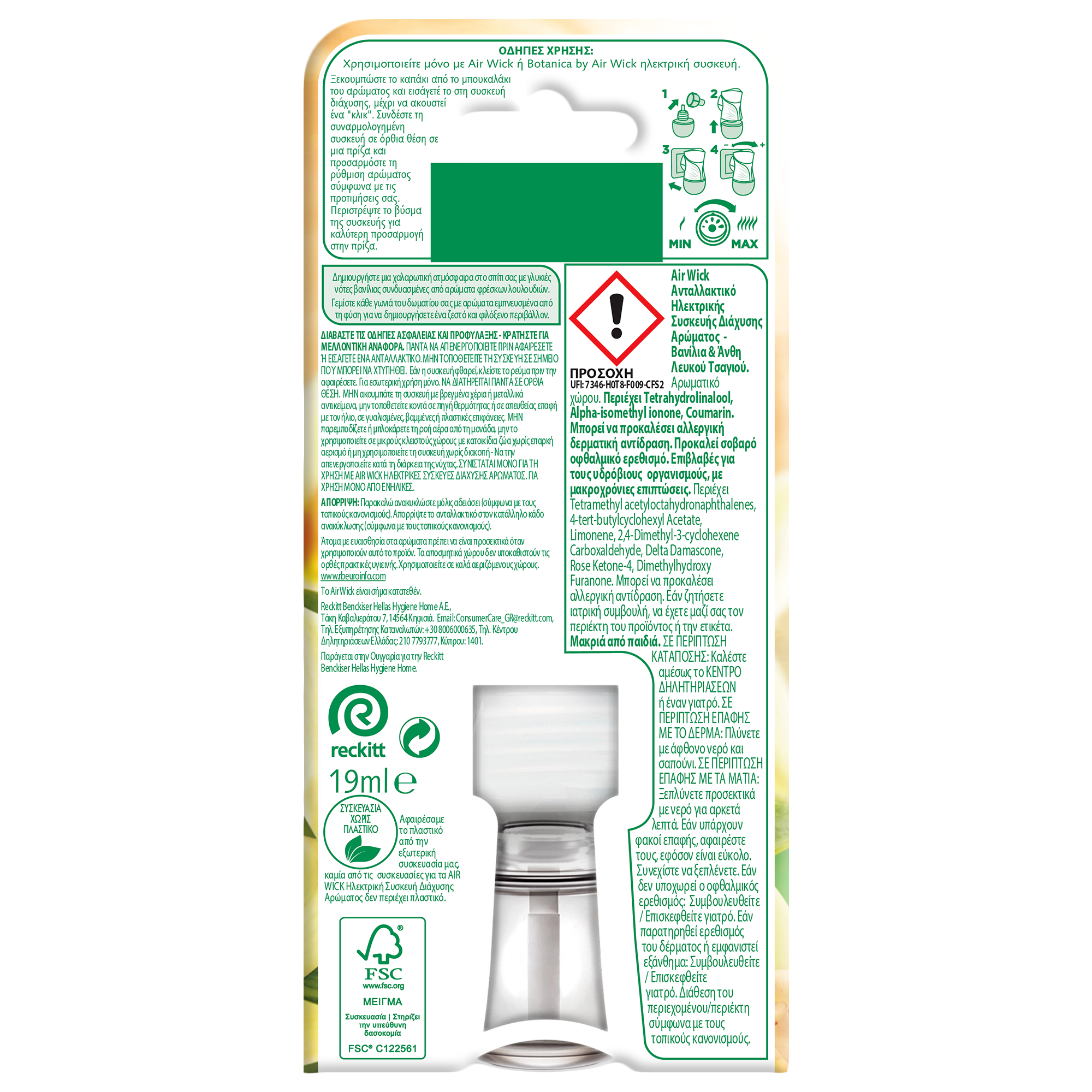 Η νέα σύνθεση περιέχει Συστατικά Φυσικής Προέλευσης με έγχυμαφυσικών αιθέριων ελαίων, φτιαγμένα για να σας προσφέρουν μια μοναδικήαρωματική εμπειρία. Δημιουργήστε μια χαλαρωτική ατμόσφαιρα στο σπίτι σας με γλυκιές νότες βανίλιας συνδυασμένες από αρώματα φρέσκων λουλουδιών. Γεμίστε κάθε γωνιά του δωματίου σας με αρώματα εμπνευσμένα από τη φύση γιανα δημιουργήσετε ένα ζεστό και φιλόξενο περιβάλλον. Αφαιρέσαμε το πλαστικό από τη συσκευασία μας, τώρα όλες οι συσκευασίες για τα Air Wick Ηλεκτρική Συσκευή Διάχυσης Αρώματος δεν περιέχουν πλαστικό.