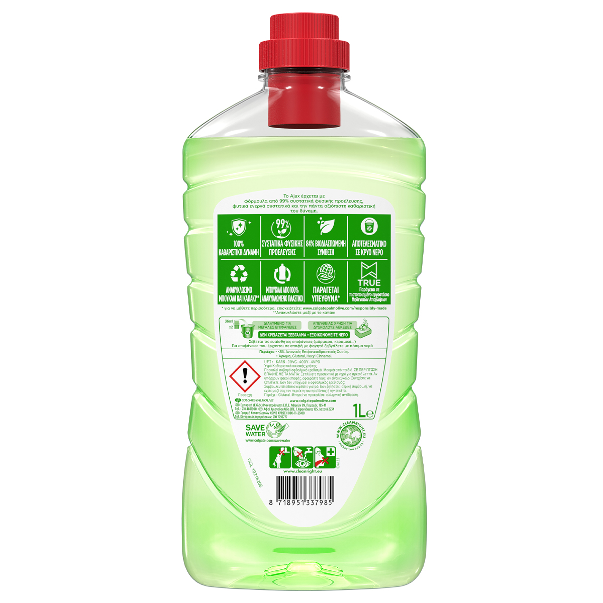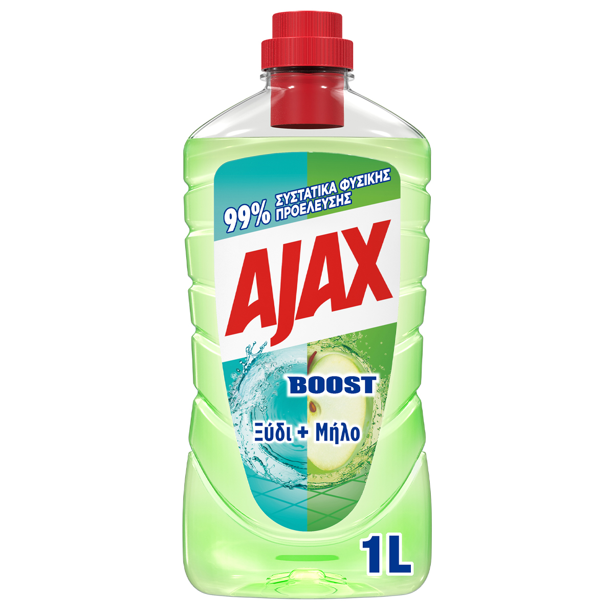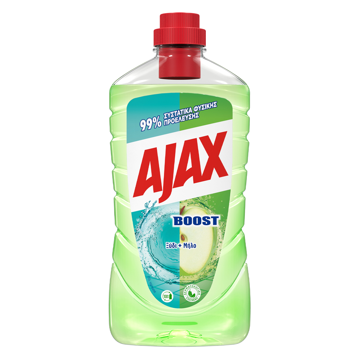 Το Ajax ανανεώνεται με καινούργια σύνθεση, από 99% συστατικά φυσικής προέλευσης και 100% καθαριστική δύναμη. 84% βιοδιασπώμενη σύνθεση. Ανακυκλώσιμο μπουκάλι & καπάκι. Μπουκάλι από 100% ανακυκλωμένο πλαστικό. Παρασκευάζεται σε πιστοποιημένο εργοστάσιο μηδενικών αποβλήτων. Άρωμα με φυσικά εκχυλίσματα.