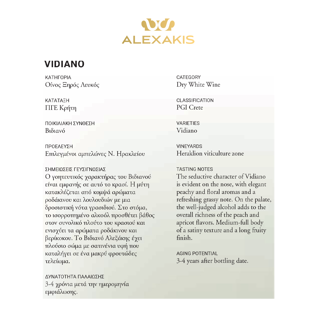 Ο γοητευτικός χαρακτήρας του Βιδιανού είναι εμφανής σε αυτό το κρασί. Η μύτη κατακλύζεται από κομψά αρώματα ροδάκινου και λουλουδιών με μια δροσιστική νότα γρασιδιού. Στο στόμα το ισορροπημένο αλκοόλ προσθέτει βάθος στον συνολικό πλούτο του κρασιού και ενισχύει τα αρώματα ροδάκινου και βερίκοκου. Το Αλεξάκης Βιδιανό έχει πλούσιο σώμα με σατινένια υφή που καταλήγει σε ένα μακρύ φρουτώδες τελείωμα.