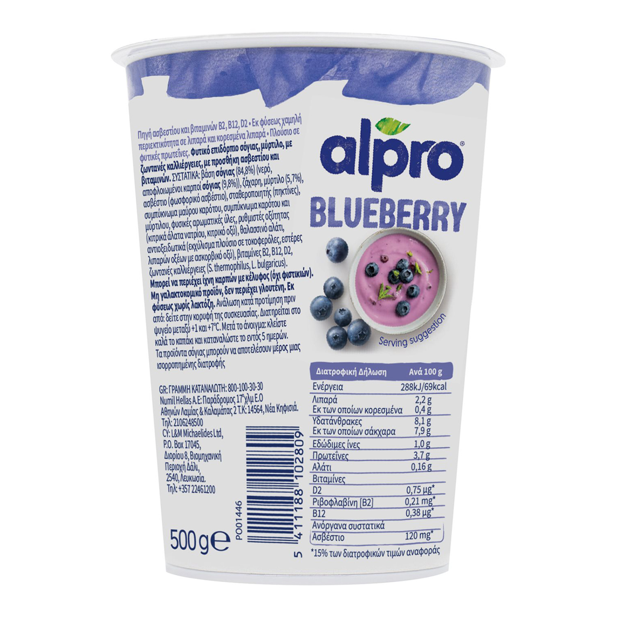 Φυτικό επιδόρπιο σόγιας, μύρτιλο, με ζωντανές καλλιέργειες, με προσθήκη ασβεστίου και βιταμινών. NEA Φυτικά επιδόρπια Alpro με ζωντανές καλλιέργειες! Αγαπάμε μύρτιλα! Και φυτικό επιδόρπιο Alpro ειδικά όταν αυτό αναμειγνύεται με ζουμερά κομμάτια φρούτων που δίνουν στη μεταξένια λεία υφή του την τέλεια ισορροπία γλυκιάς και ξινής γεύσης. Ένα πραγματικά λαχταριστό και δροσερό αποτέλεσμα! Μόνο μια δοκιμή θα σε πείσει. Πλούσιο σε φυτικές πρωτεΐνες. Πηγή ασβεστίου* και βιταμινών Β2, Β12 & D. *Το ασβέστιο απαιτείται για τη διατήρηση της φυσιολογικής κατάστασης των οστών, στα πλαίσια μιας ισορροπημένης διατροφής και ενός υγιεινού τρόπου ζωής.