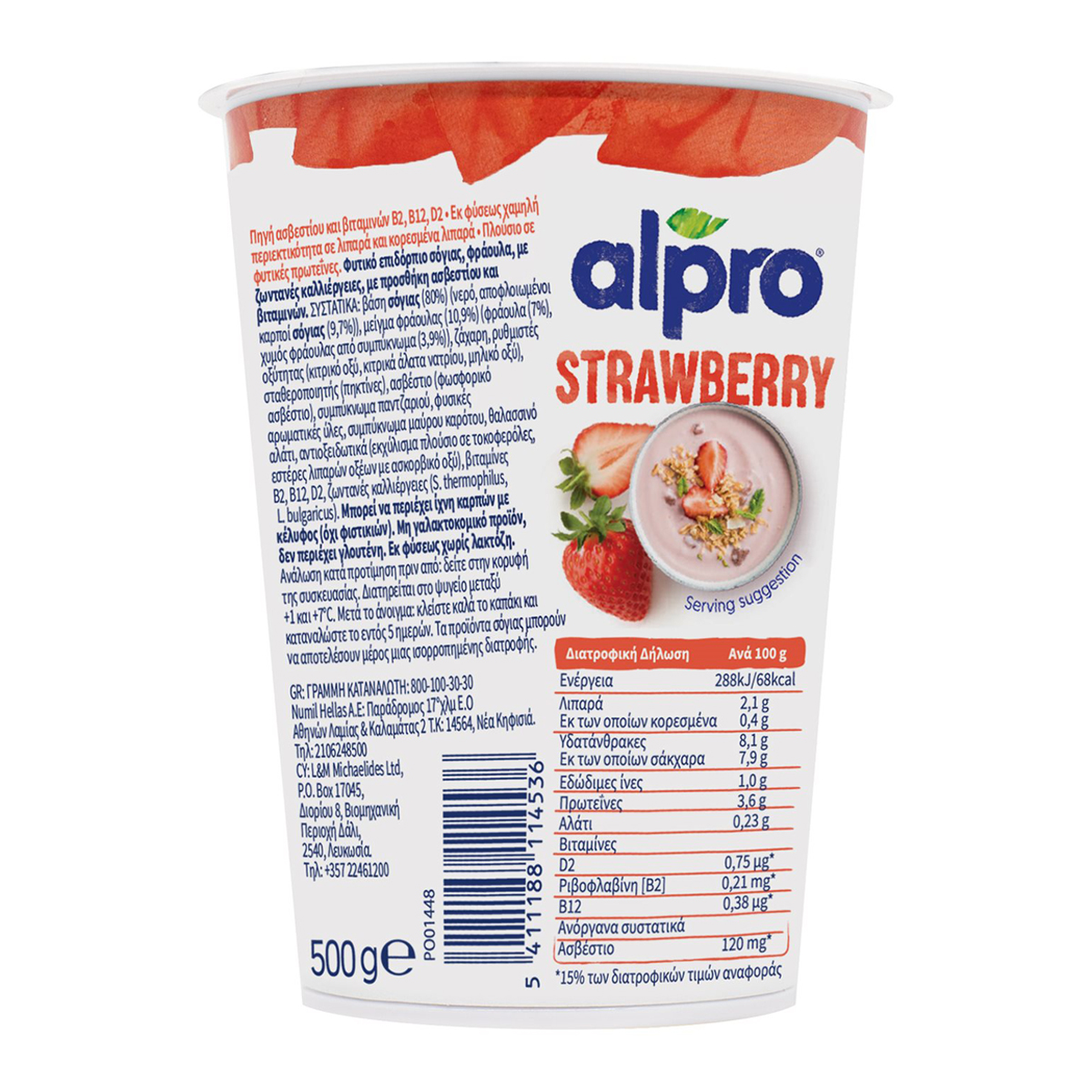 Φυτικό επιδόρπιο σόγιας, φράουλα, με ζωντανές καλλιέργειες, με προσθήκη ασβεστίου και βιταμινών. NEA Φυτικά επιδόρπια Alpro με ζωντανές καλλιέργειες. Αγαπάς τις φρουτώδεις γεύσεις; Βάλε τα φρούτα στη διατροφή σου εύκολα, απολαυστικά και θρεπτικά! Απόλαυσε την απαλή του υφή και γεύση με ολόκληρα κομμάτια φράουλας, ώστε κάθε μπουκιά να είναι λαχταριστή. Μόνο μια δοκιμή θα σε πείσει. Πλούσιο σε φυτικές πρωτεΐνες. Πηγή ασβεστίου* και βιταμινών Β2, Β12 & D. *Το ασβέστιο απαιτείται για τη διατήρηση της φυσιολογικής κατάστασης των οστών, στα πλαίσια μιας ισορροπημένης διατροφής και ενός υγιεινού τρόπου ζωής.