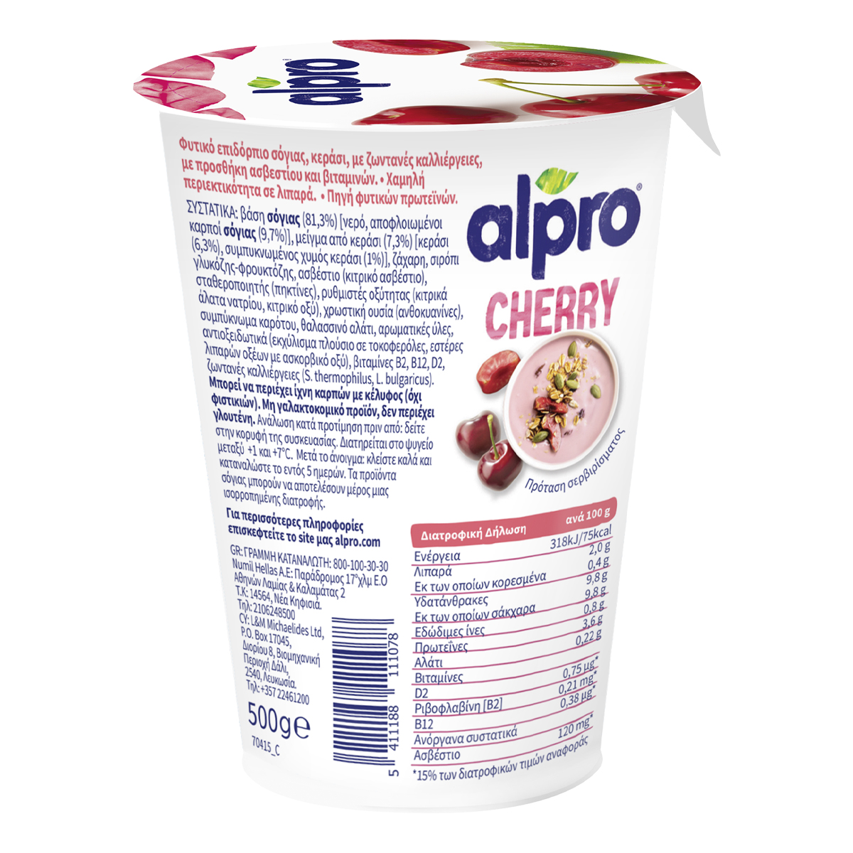 Φυτικό επιδόρπιο σόγιας, κεράσι, με ζωντανές καλλιέργειες, με προσθήκη ασβεστίου και βιταμινών. Αγαπάς τις φρουτώδεις γεύσεις; Βάλε τα φρούτα στη διατροφή σου εύκολα, απολαυστικά και θρεπτικά! Απόλαυσε την απαλή του υφή και γεύση με ολόκληρα κομμάτια από κεράσι, ώστε κάθε μπουκιά να είναι λαχταριστή.Μόνο μια δοκιμή θα σε πείσει. Πηγή φυτικών πρωτεϊνών. Πηγή ασβεστίου* και βιταμινών Β2, Β12 & D2. *Το ασβέστιο απαιτείται για τη διατήρηση της φυσιολογικής κατάστασης των οστών, στo πλαίσιo μιας ισορροπημένης διατροφής και ενός υγιεινού τρόπου ζωής.