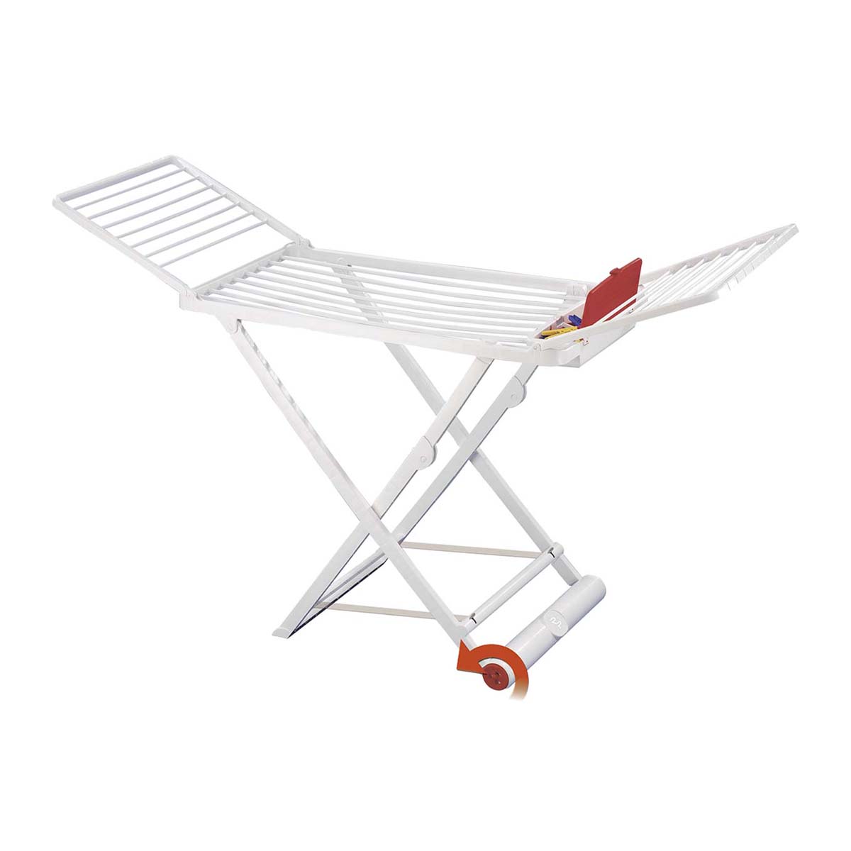 Σε άσπρο χρώμα, με ροδάκια για εύκολη μετακίνηση, διαθέτει ενσωματωμένο κόκκινο καλαθάκι για μανταλάκια και διακόπτη ασφαλείας